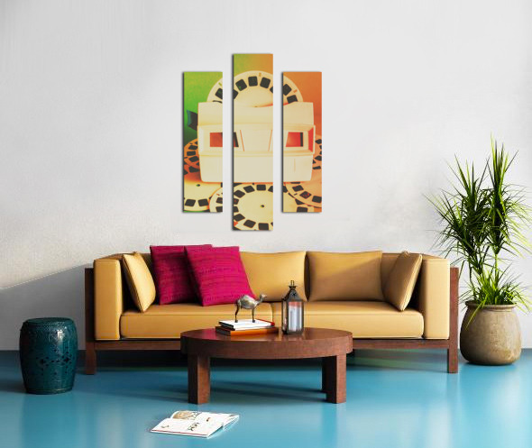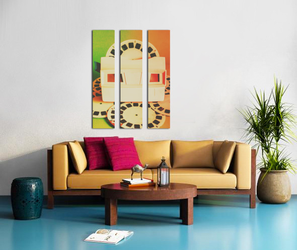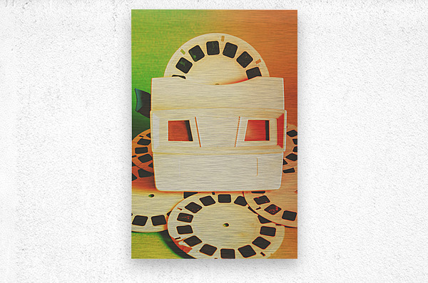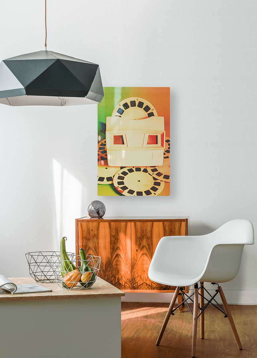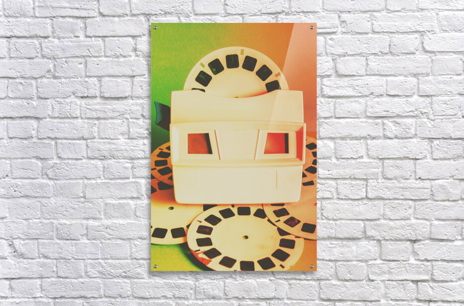 Outdated but unforgotten vintage slides viewer toy playing back past photographic memories in flares of 80s orange and green. Childhood memory flashback
