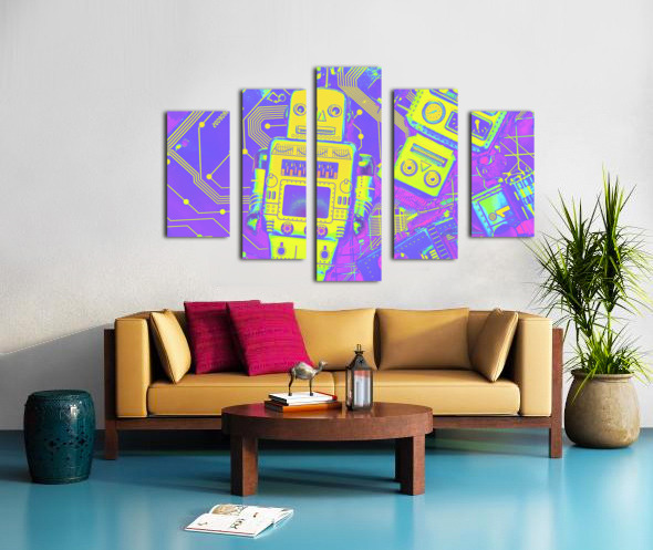 Cartoon character pop art design on android toys on gaming electronic background. Comic circuitry robots
