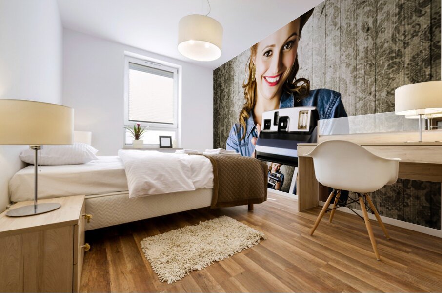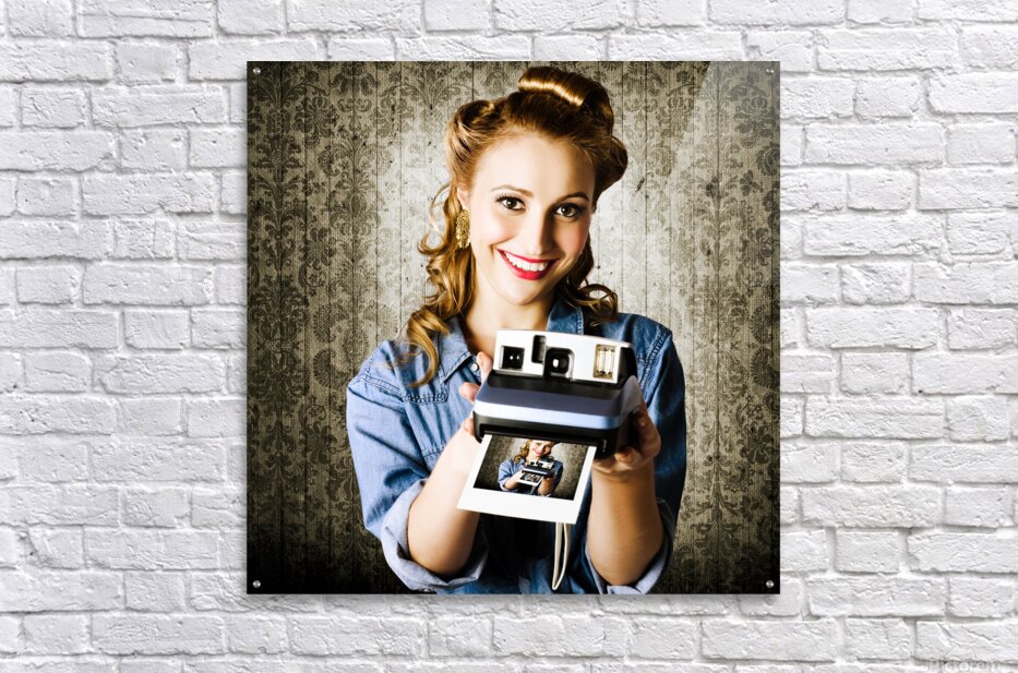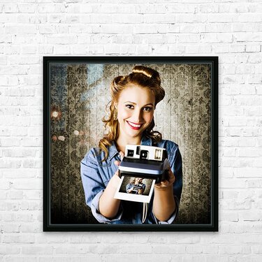 Smiling Young Vintage Girl Taking Polaroid Photo Picture Frame Printing
