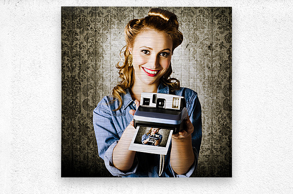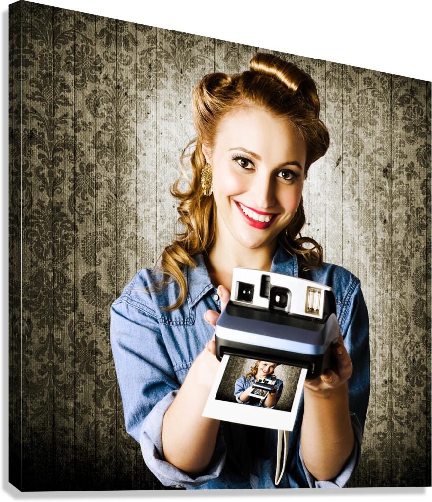 ABOUT THIS ARTWORK: SMILING YOUNG VINTAGE GIRL TAKING POLAROID PHOTO
