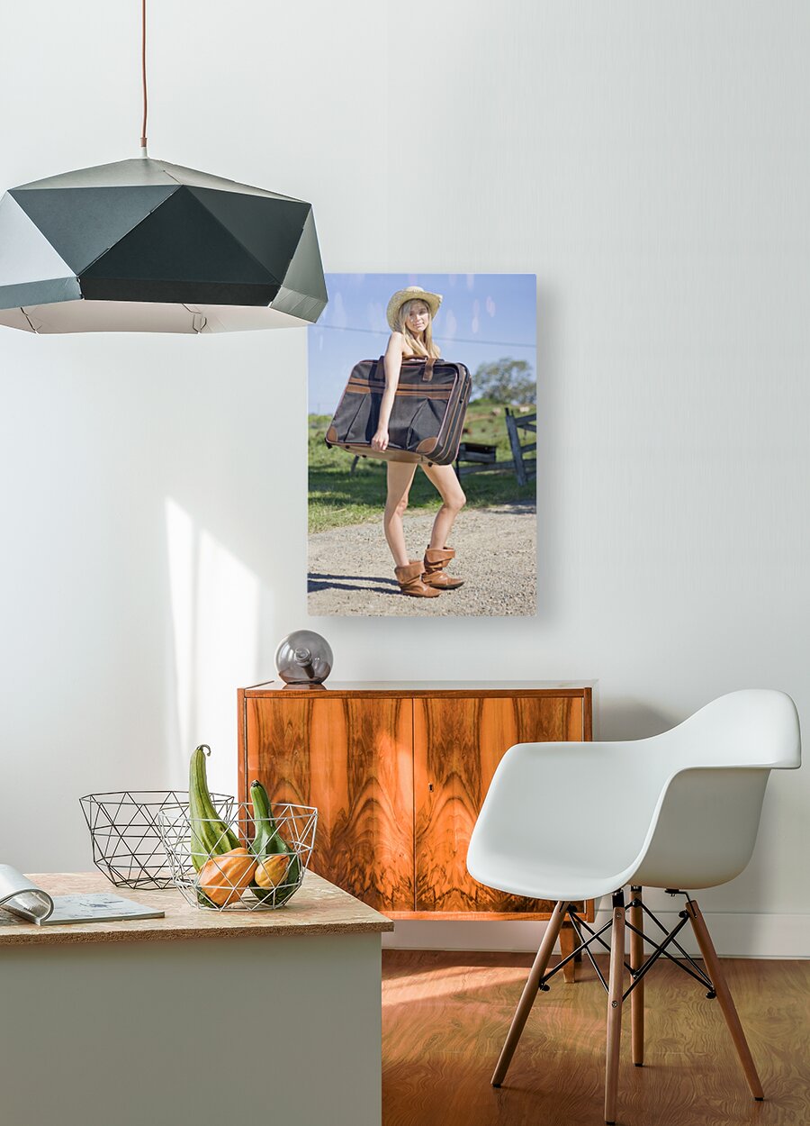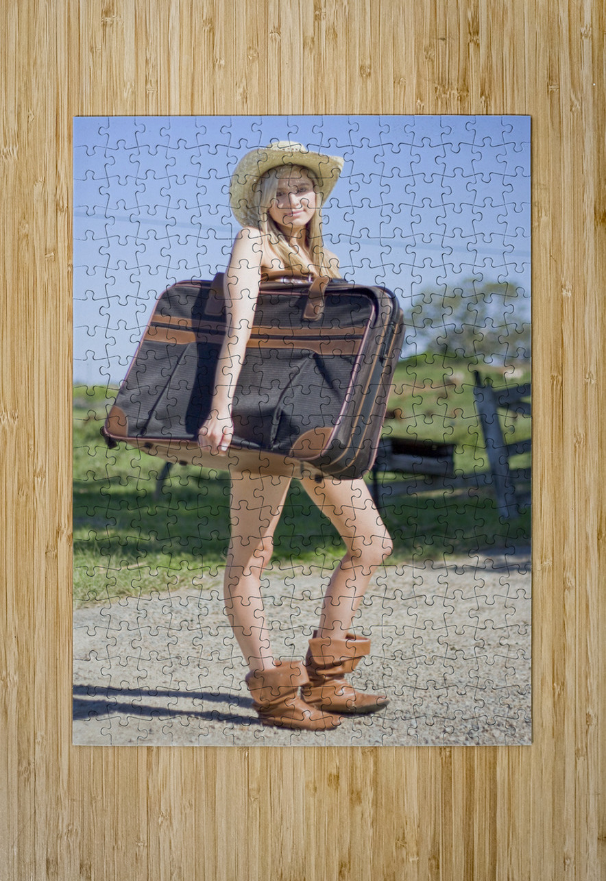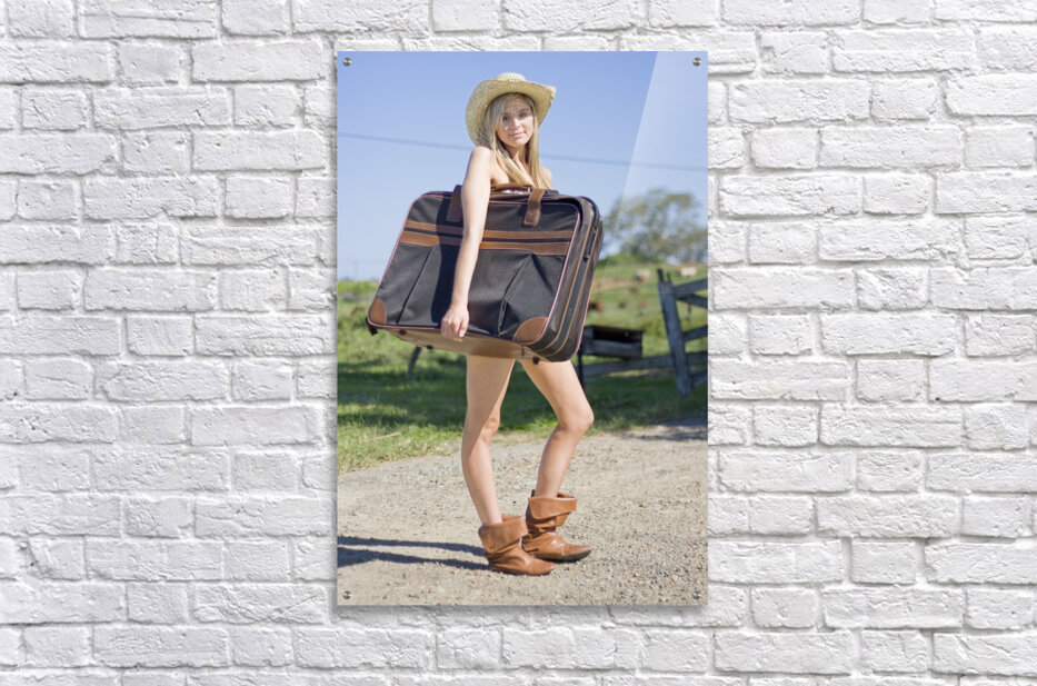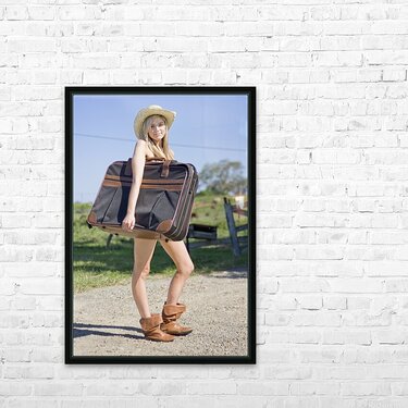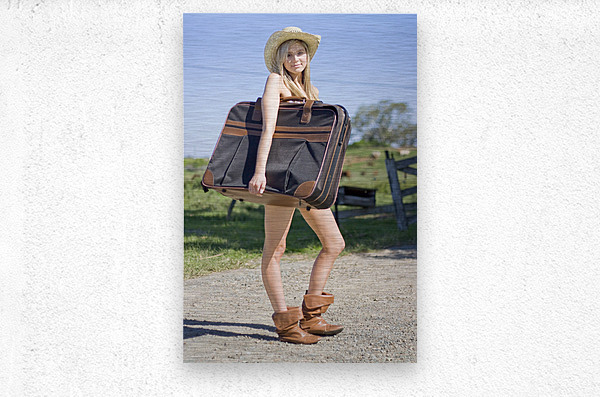 Full Body Portrait Of A Sexy Blond Female Tourist Holding Her Luggage In A Green Countryside Vacation