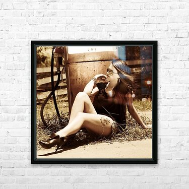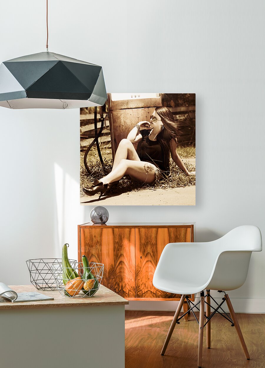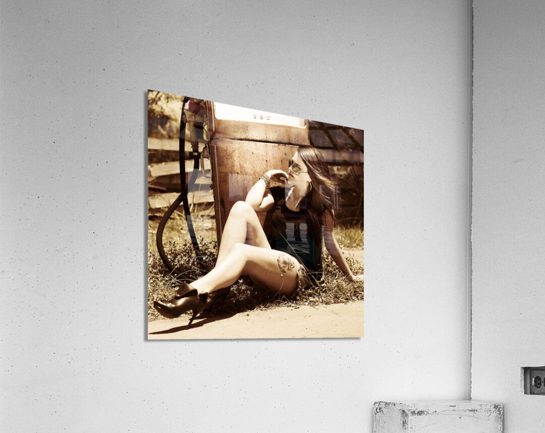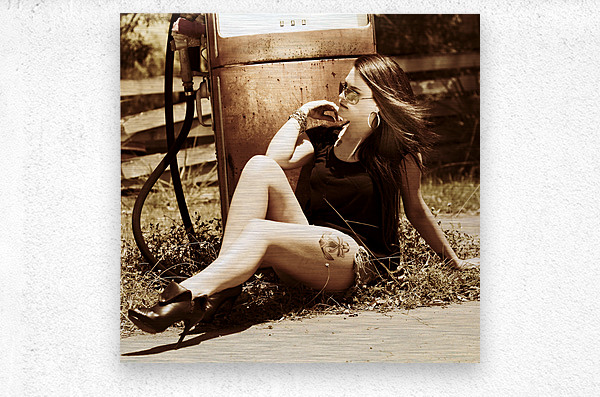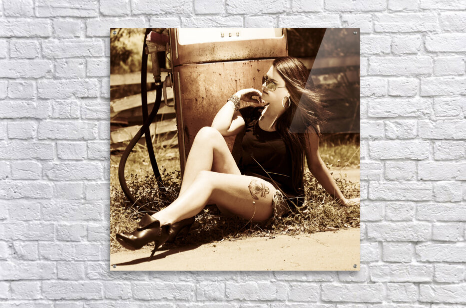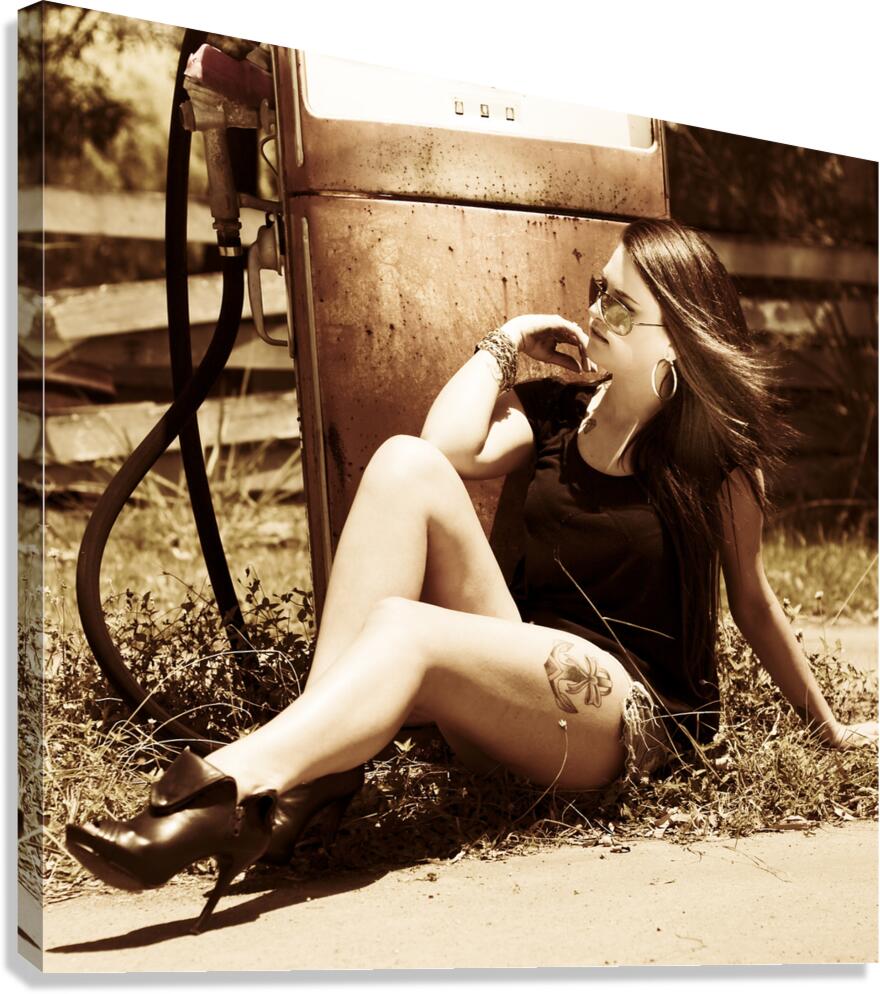Classic automobile babe kicking back on old gas pump in a scene of vintage oil and gas car culture