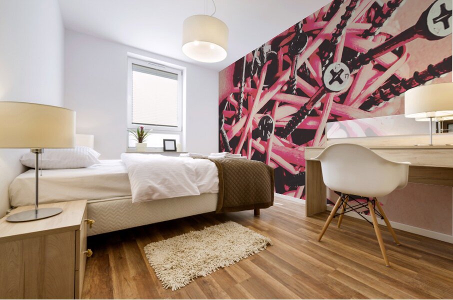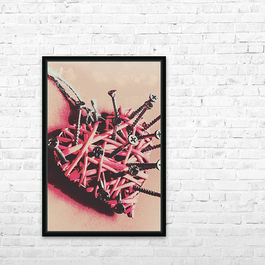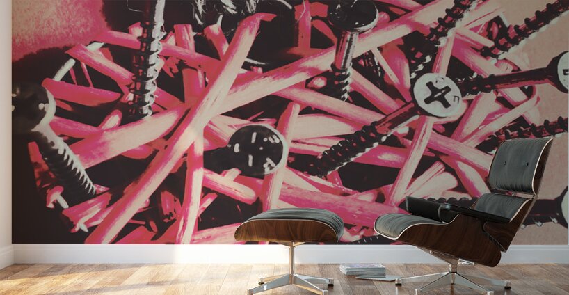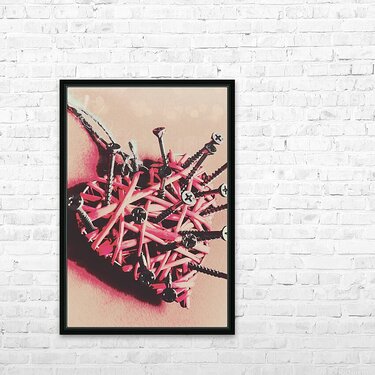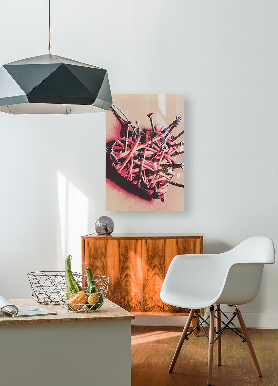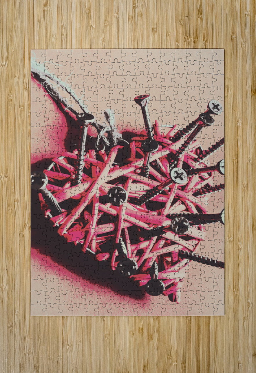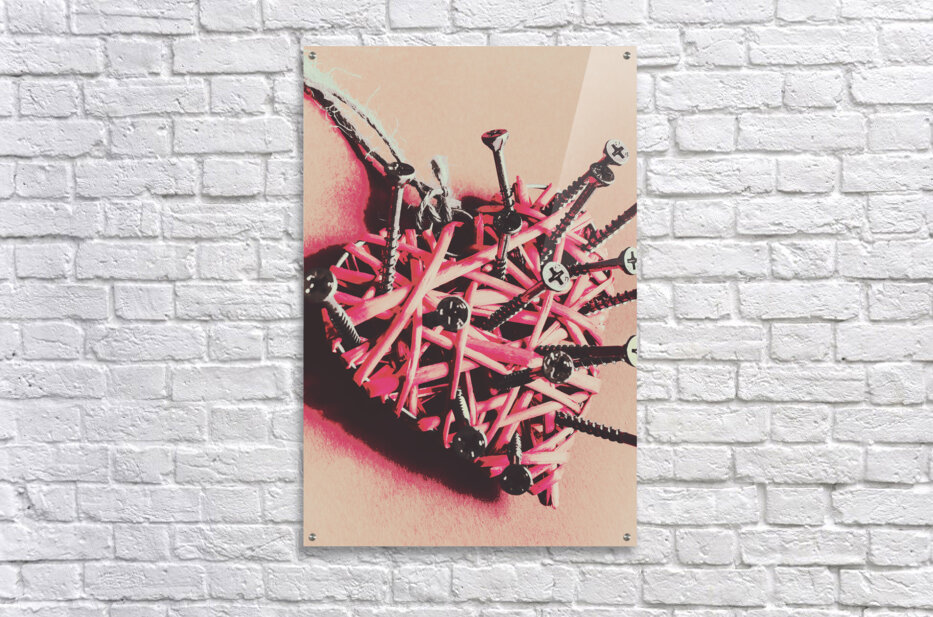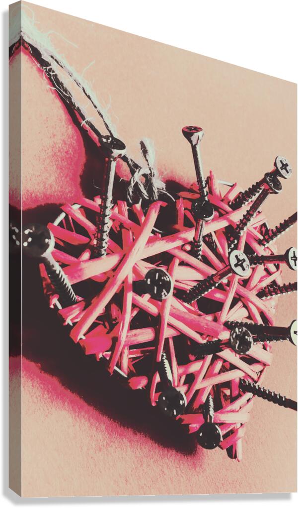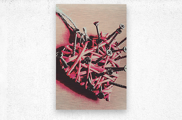 Creative fine art on a decorative romantic heart thatching under a barrage of metallic screws. Hearts and screws