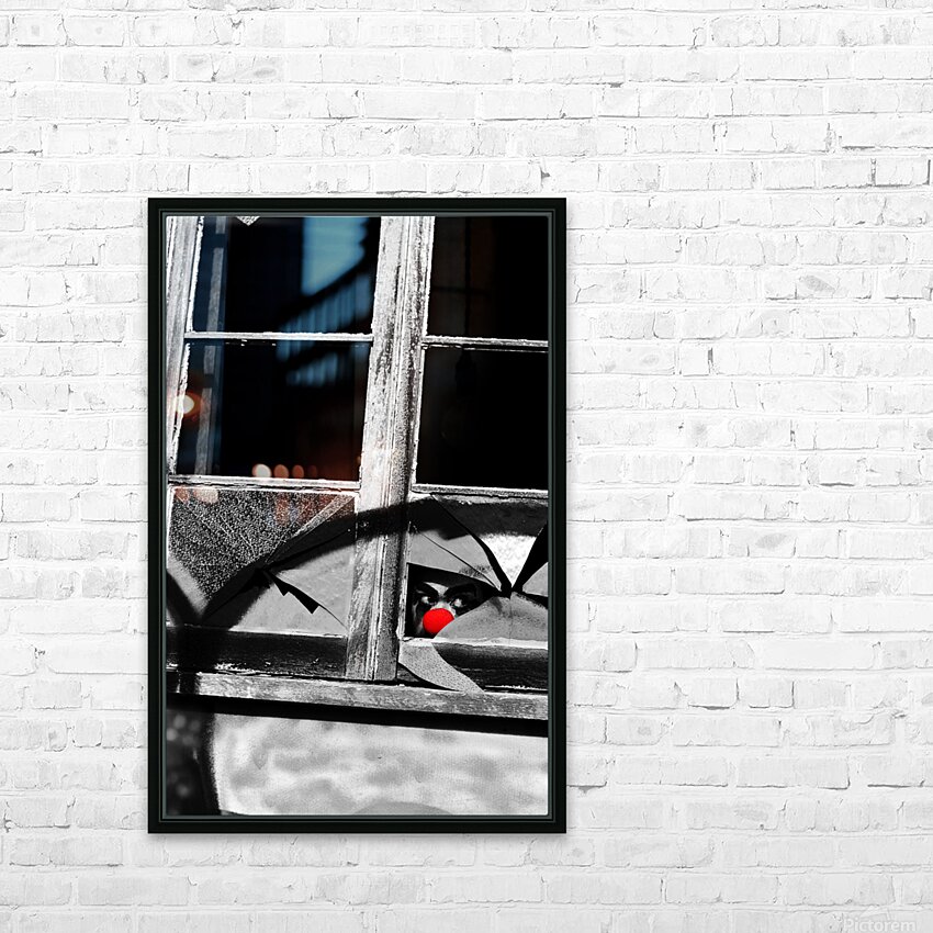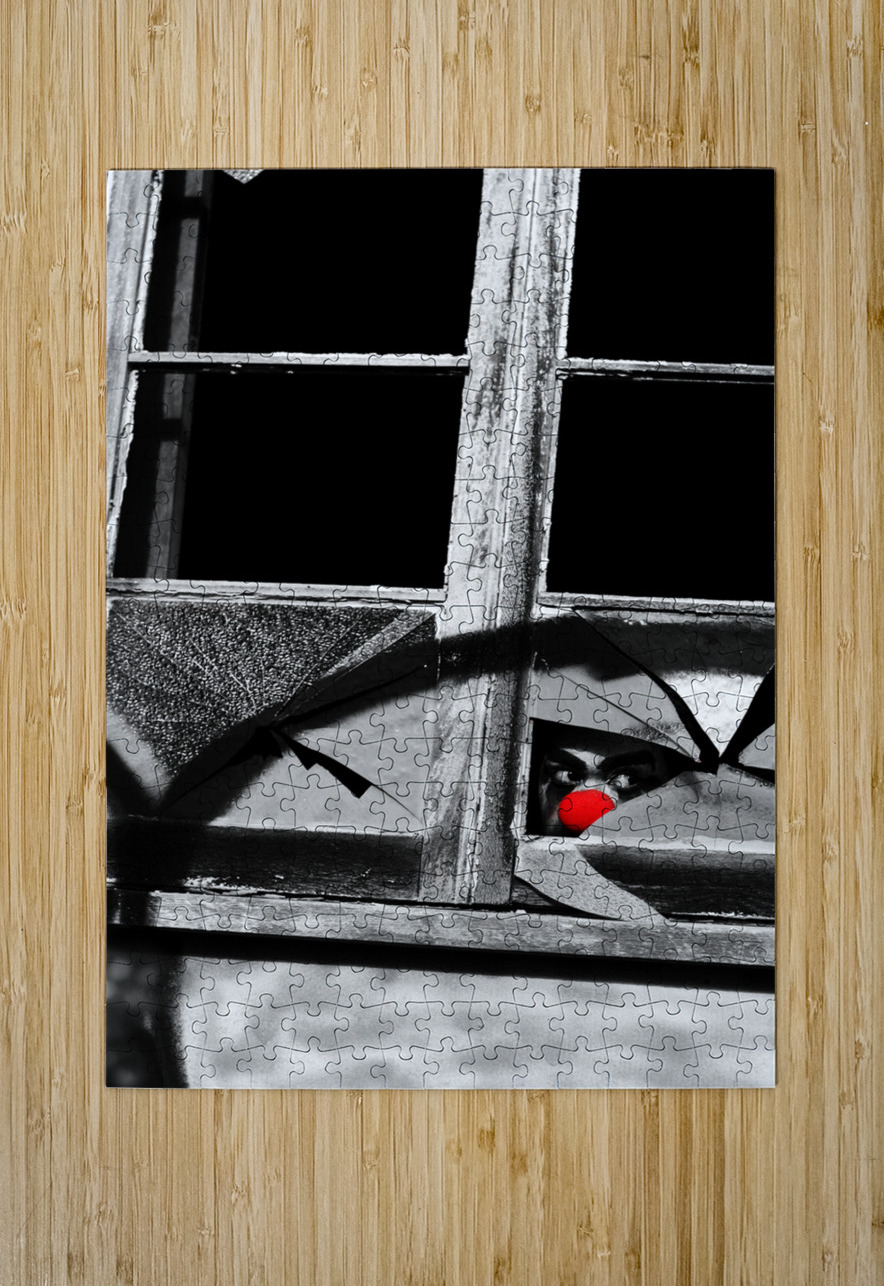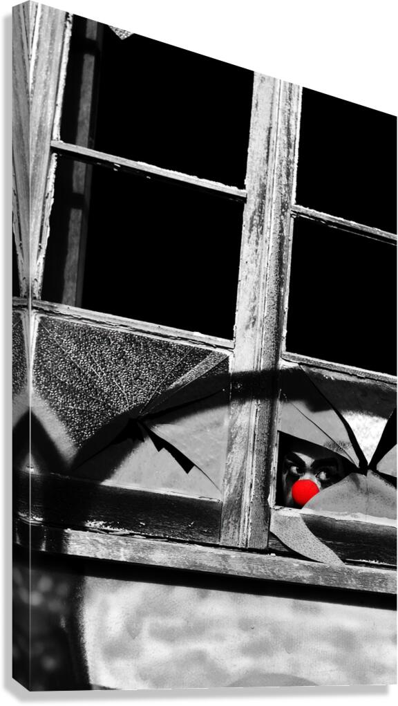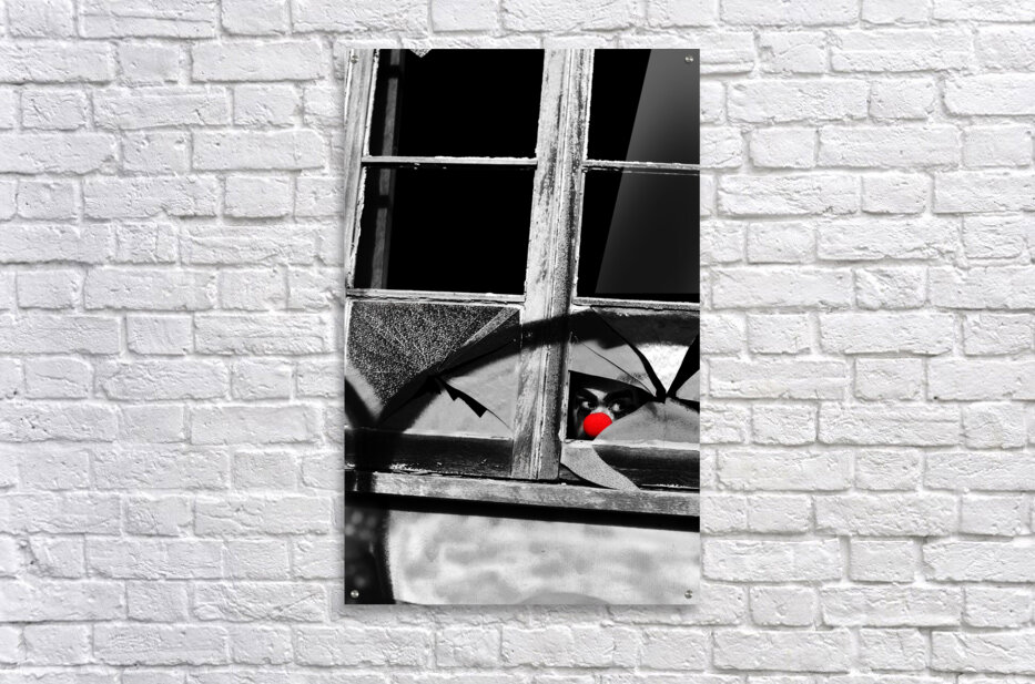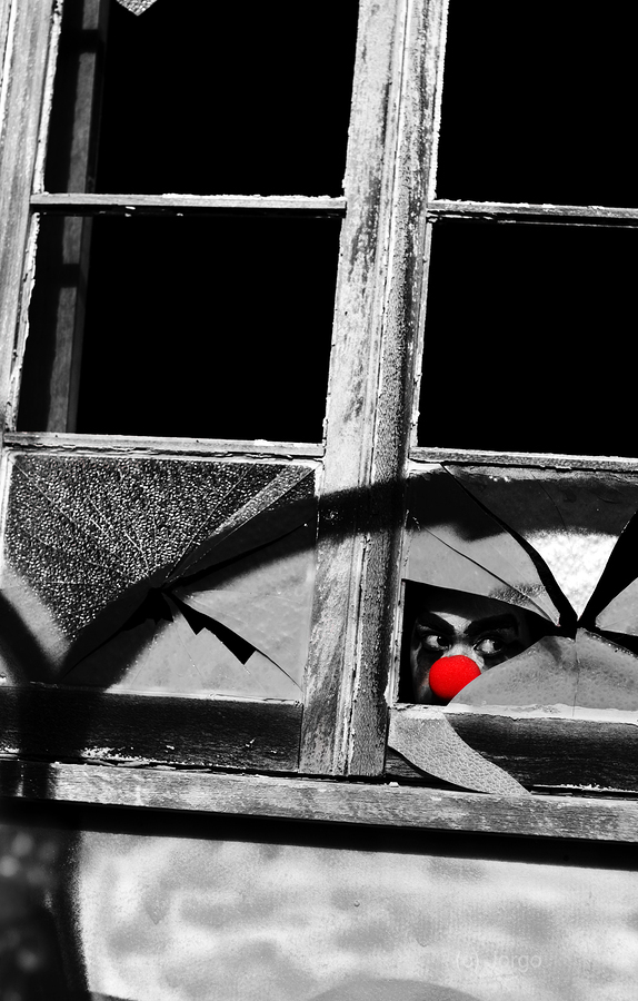 Private Eye Investigator Undercover As A Clown Secretly Does Surveillance Through A Broken Window At An Old Rundown Abandoned House
