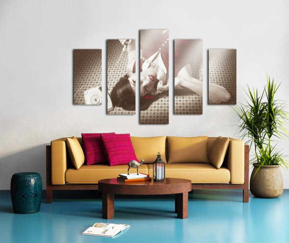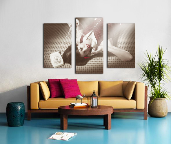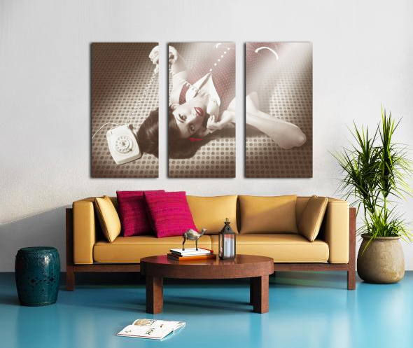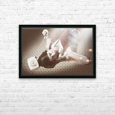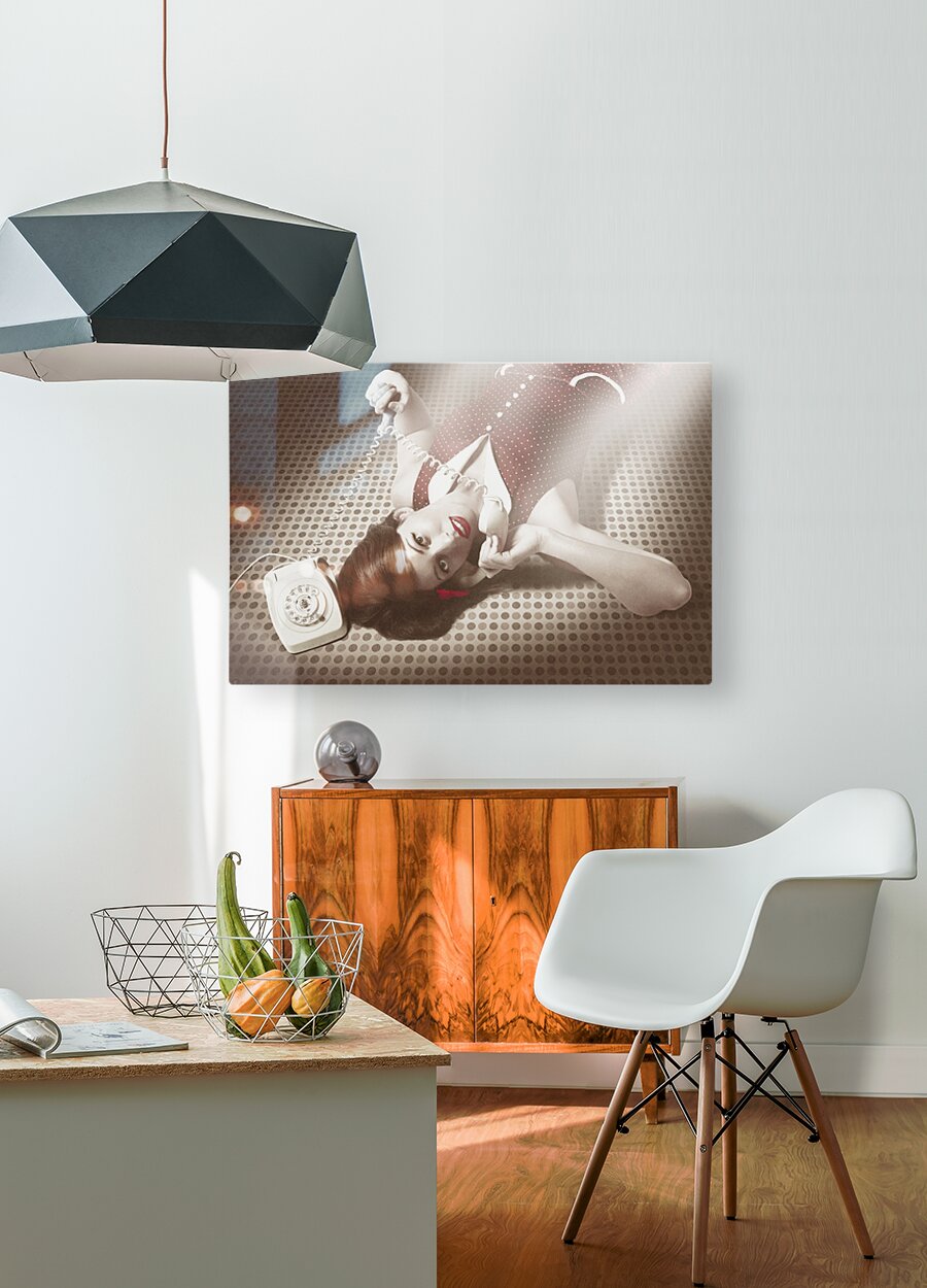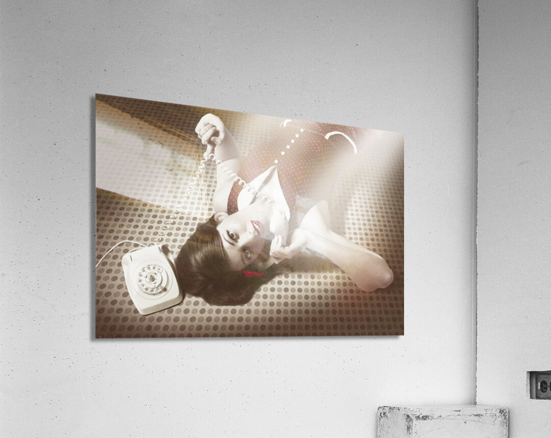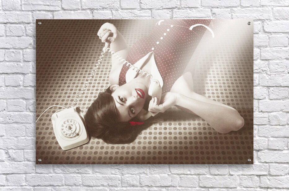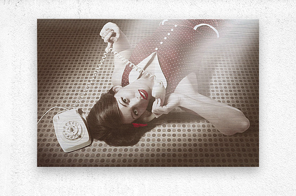 ABOUT THIS ARTWORK: BEAUTIFUL BRUNETTE PINUP WOMAN ON VINTAGE PHONE