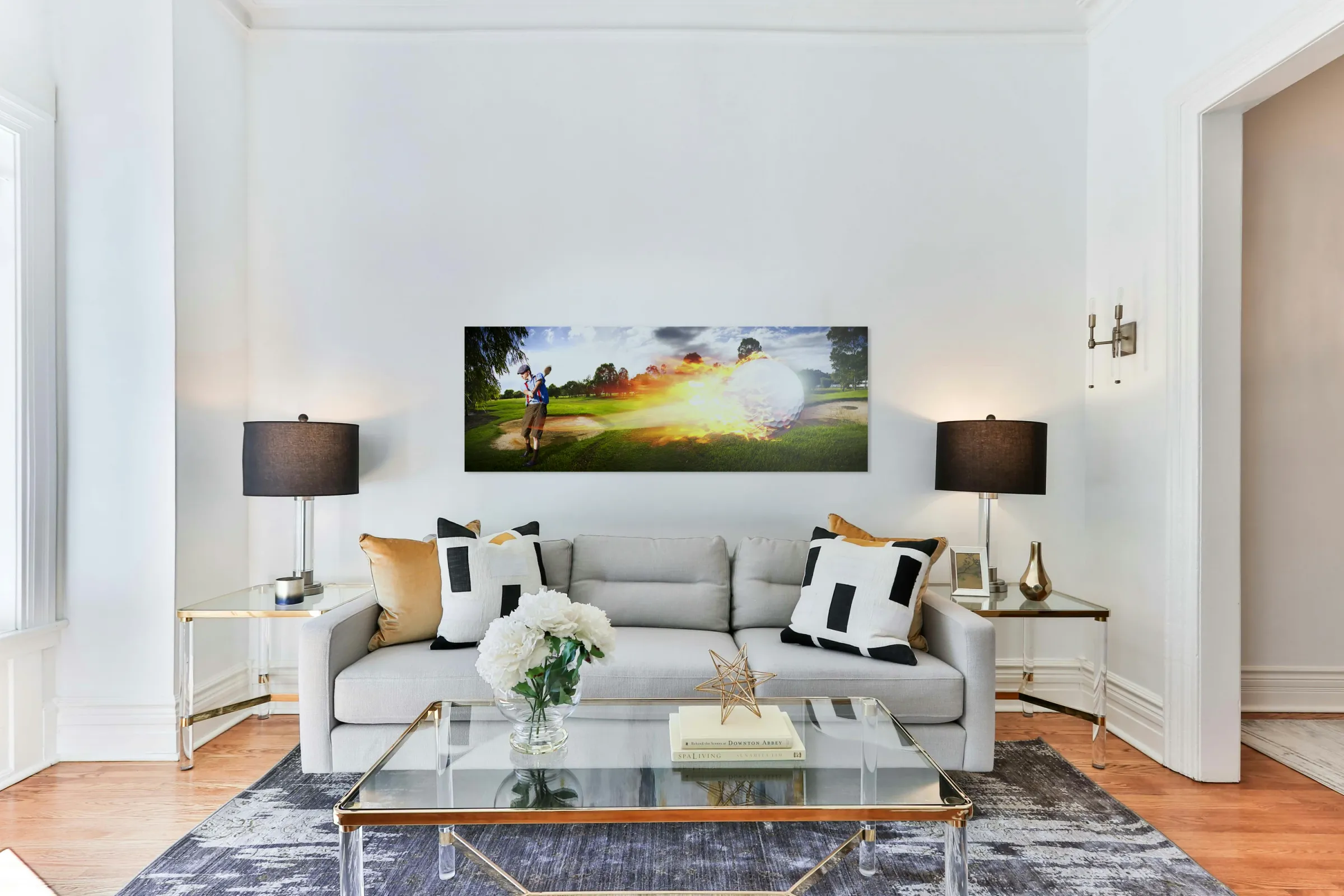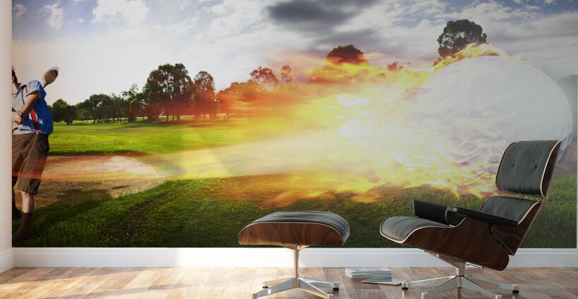 Sport Action Landscape Panoramic Of A Golf Player Hitting A Fast Paced Flaming Golf Ball Through The Golf Course Air In A Motion Of Flames And Fire