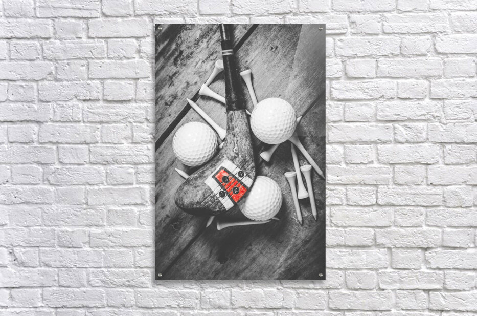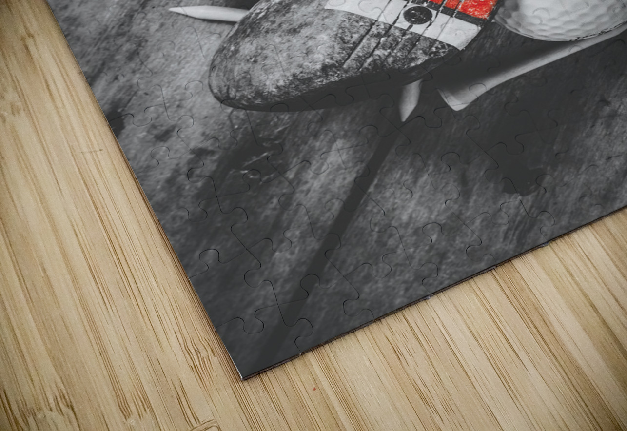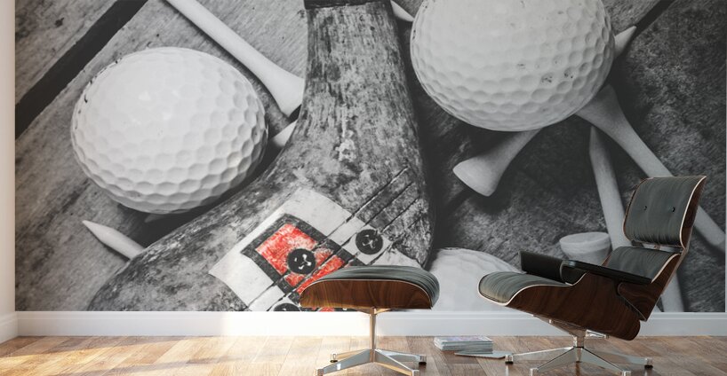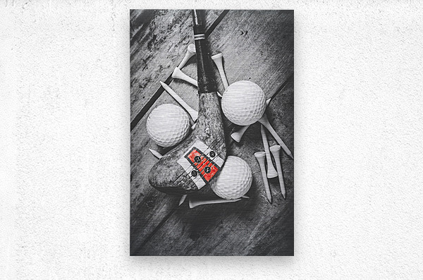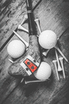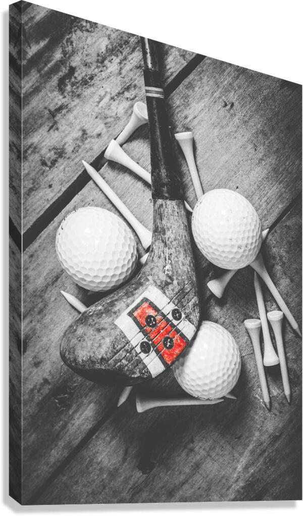 A vintage play in golfing history with selective colored wooden driver scattered with tees and golf balls