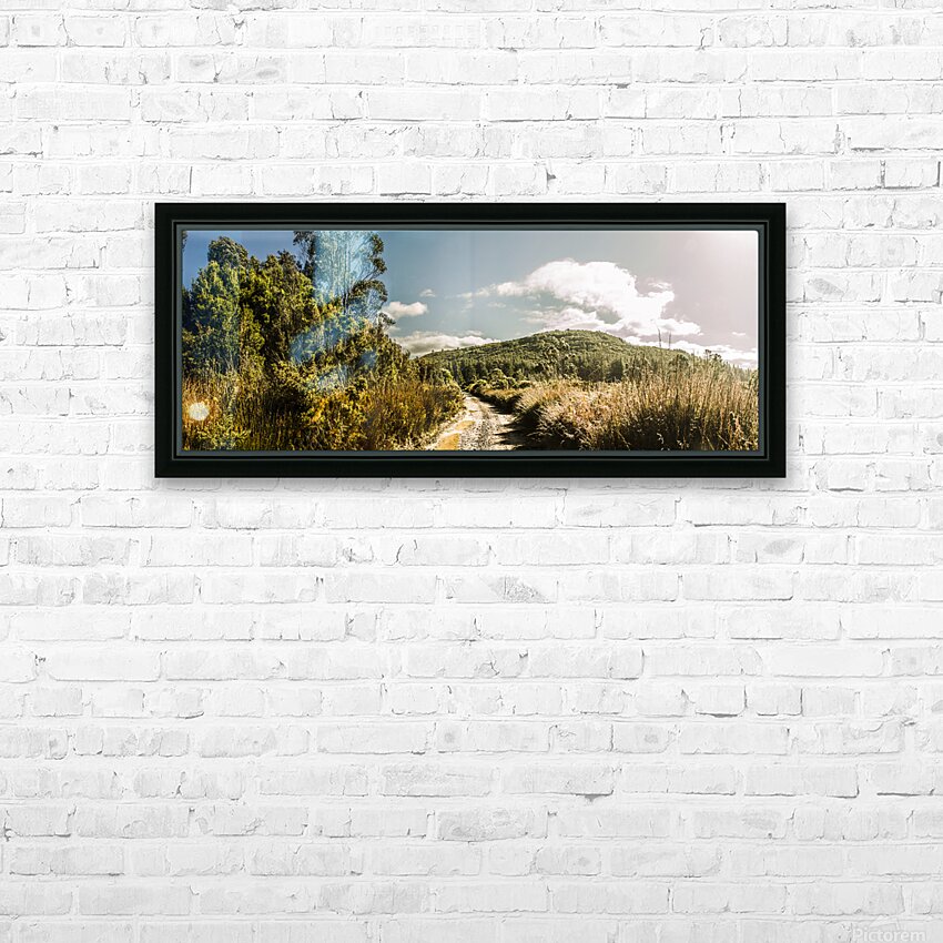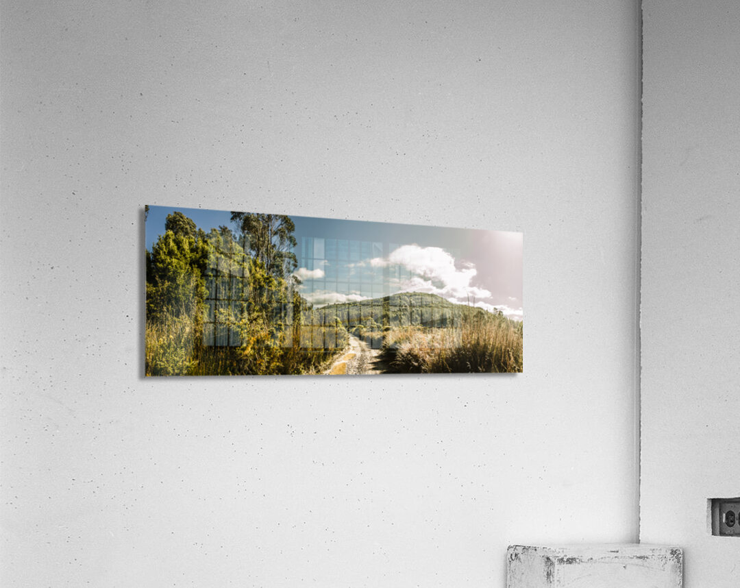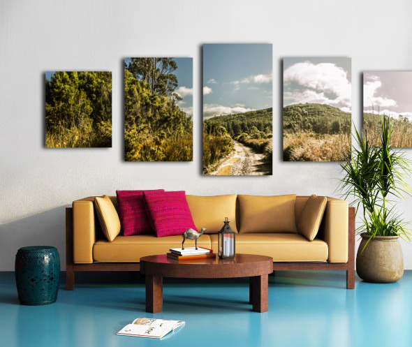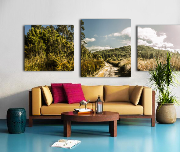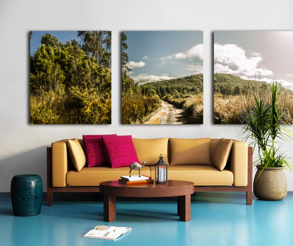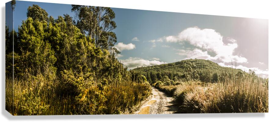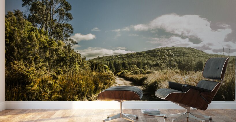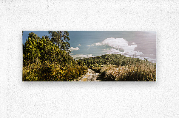 Wide angle landscape art on a summer dirt road leading through Australian countryside. Taken Zeehan Tasmania