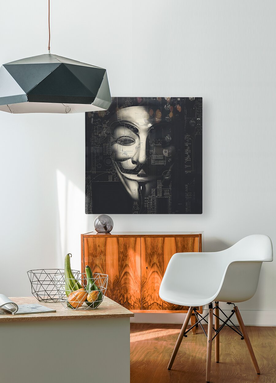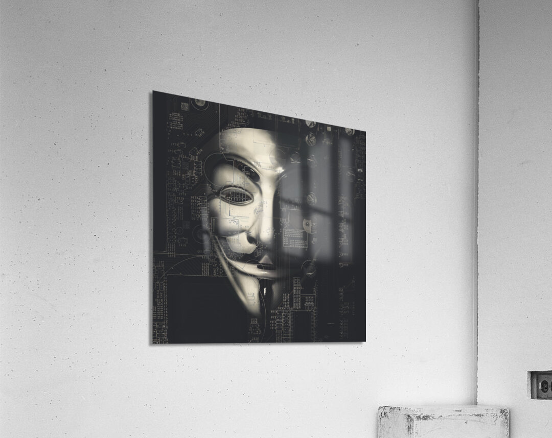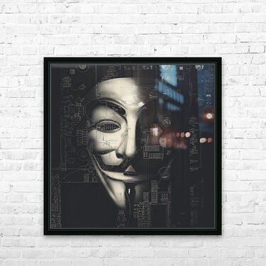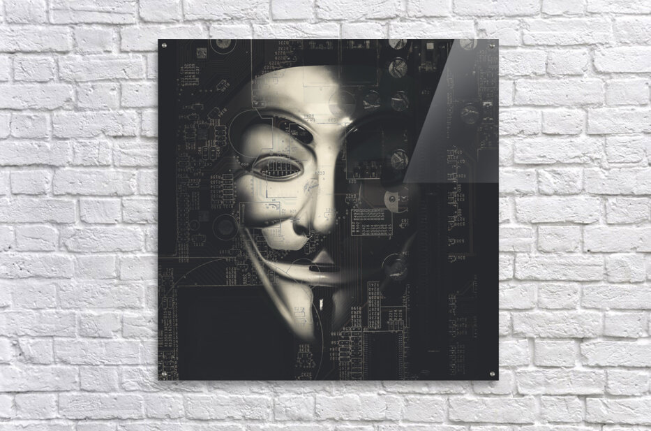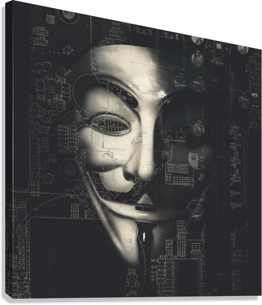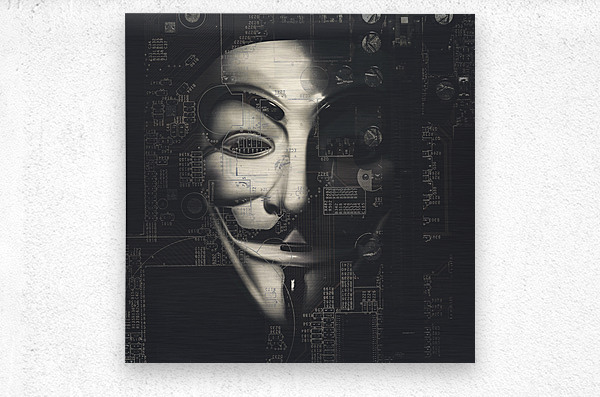 Digital artwork on the face of the hactivist group Anonymous watching encrypted personal data flow from our computers and digital devices directly to the NSA. We dont forgive we dont forget expect us