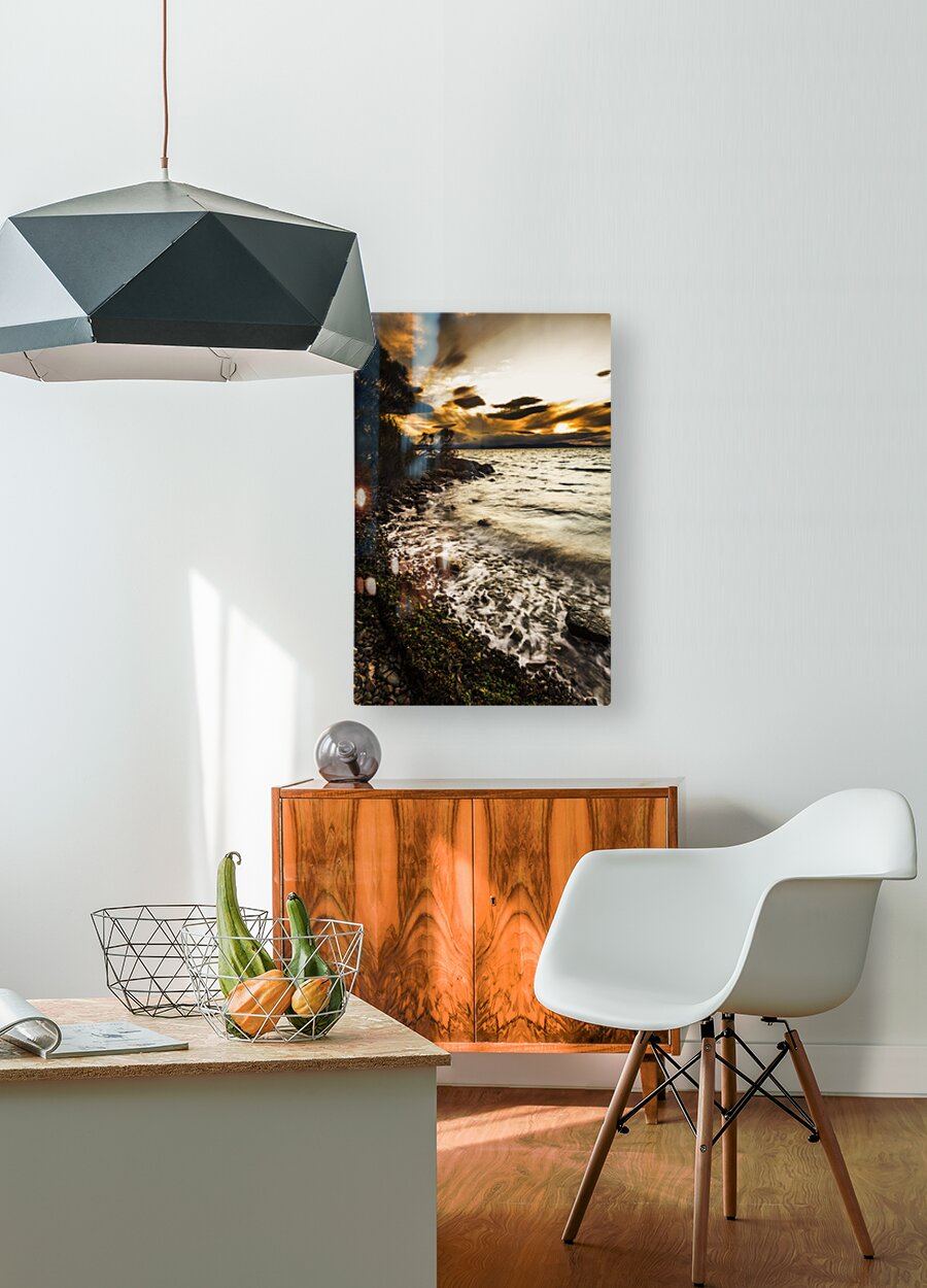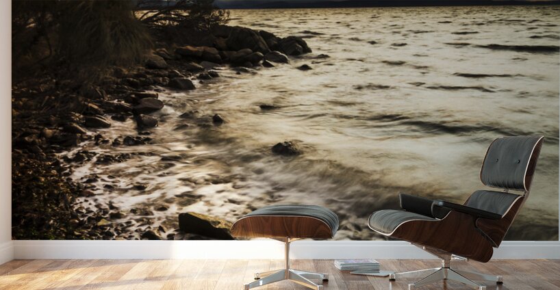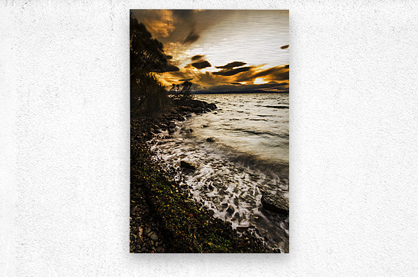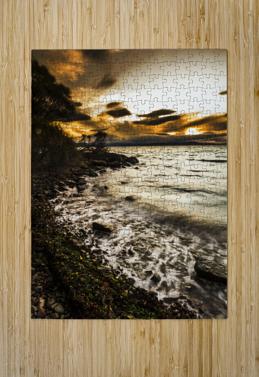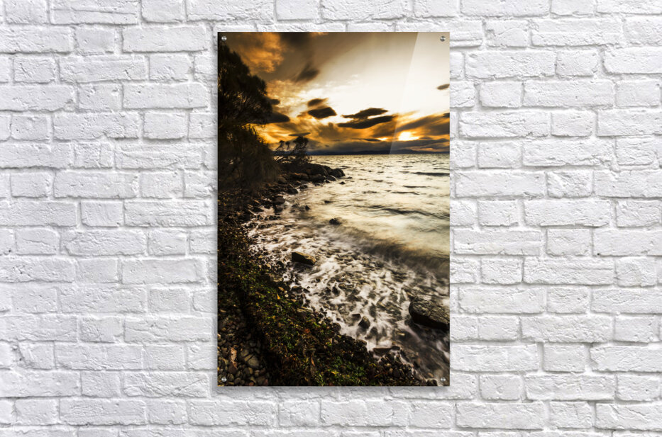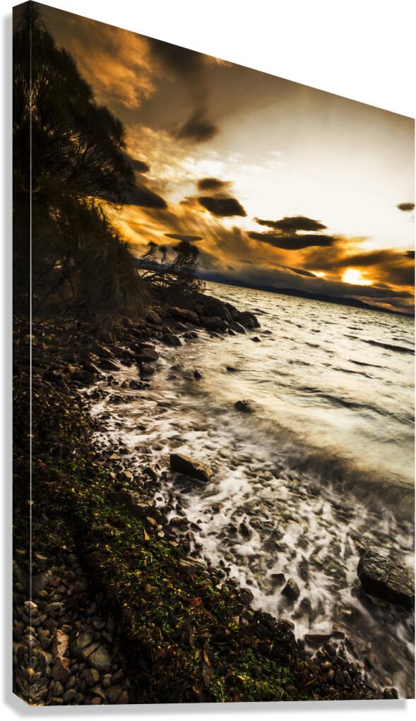 Harmony and turbulence crash the shoreline of a dramatic dark coast with storm clouds and piercing sunsets. Lunawanna Bruny Island Tasmania Australia