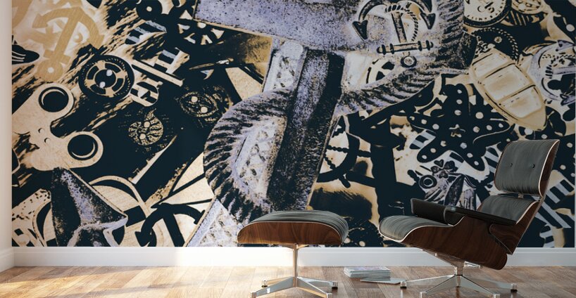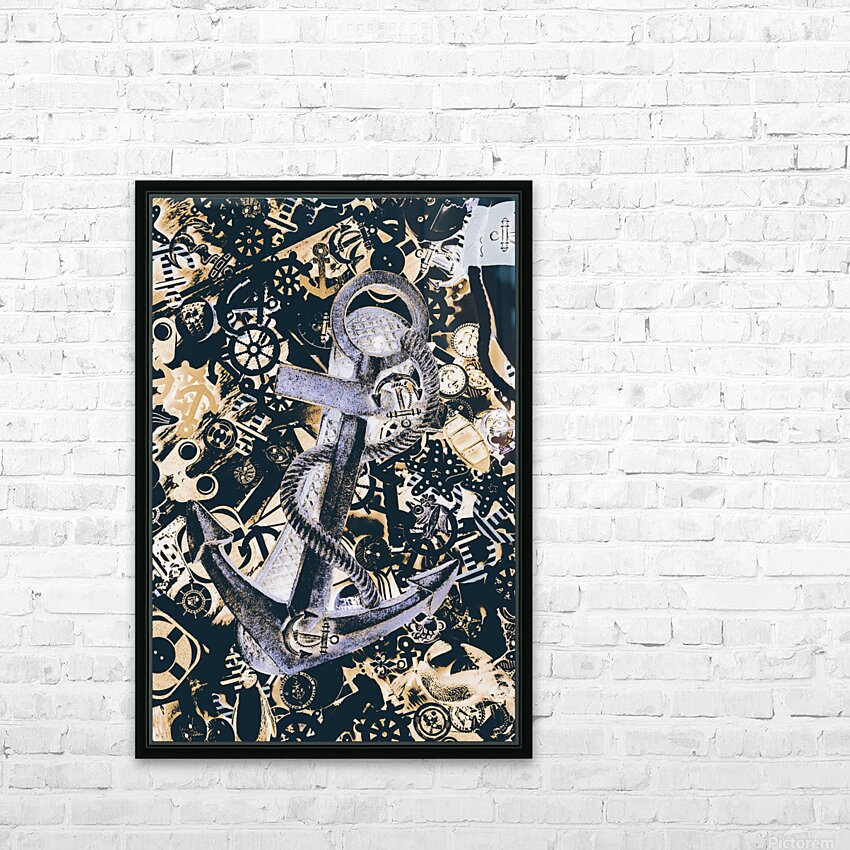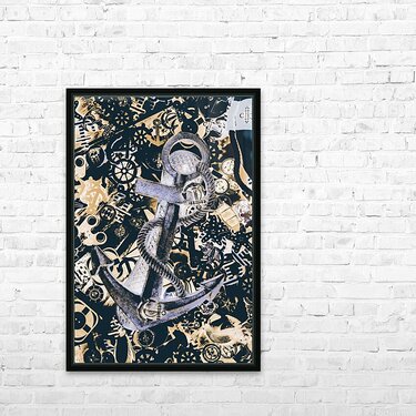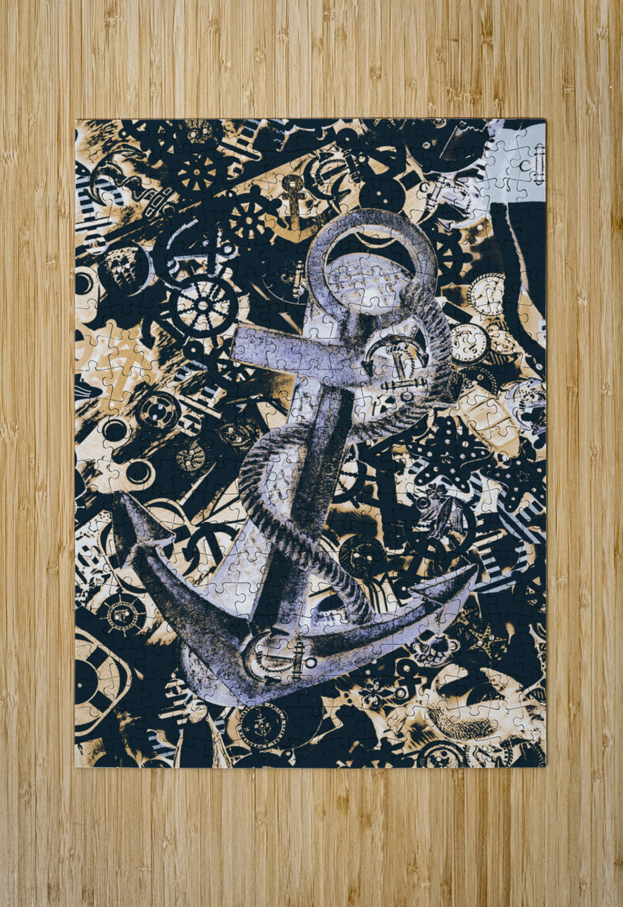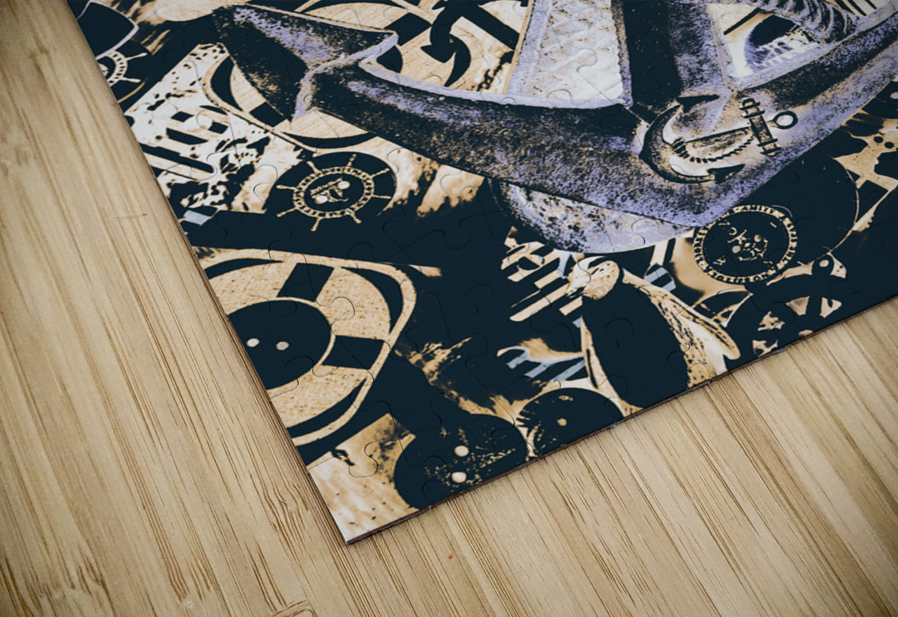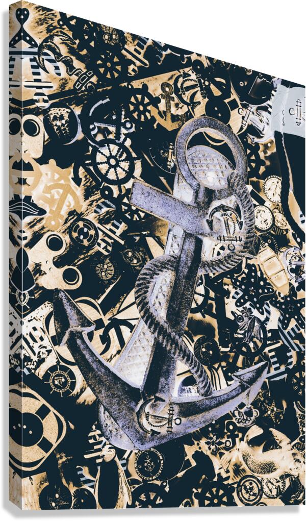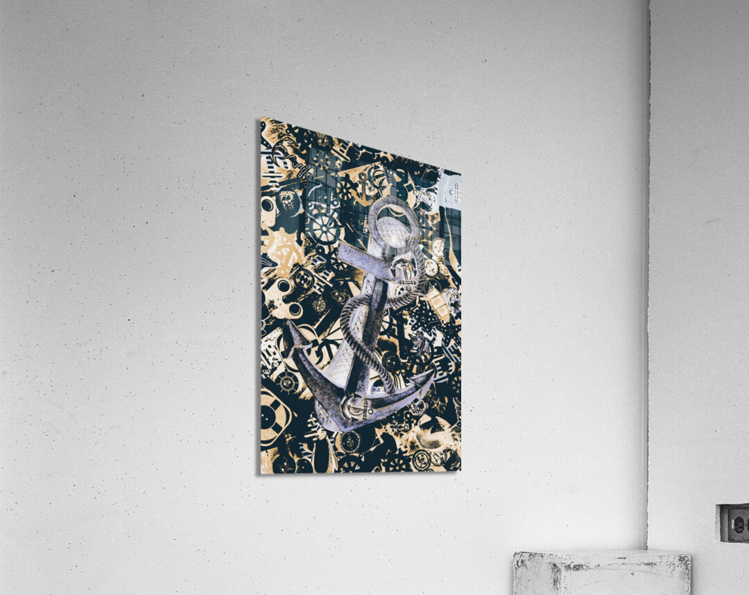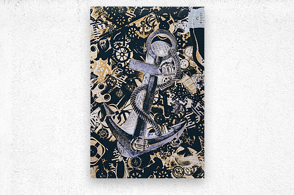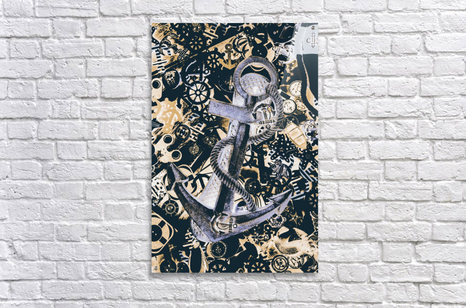 Holding port at nautical bay an anchor lays steadfast with rust and some fray before an abstract of ocean iconography