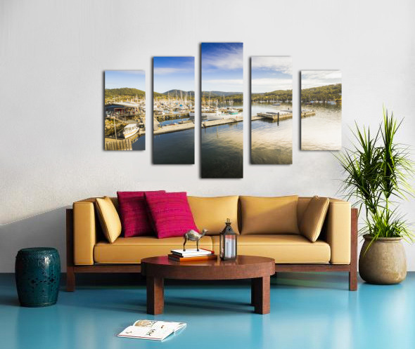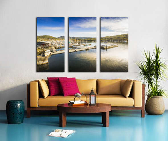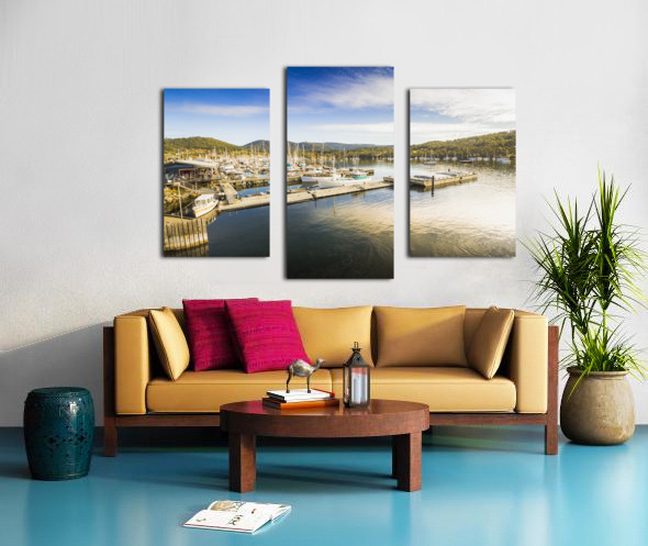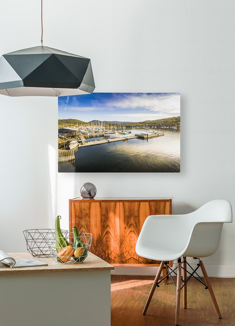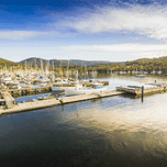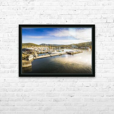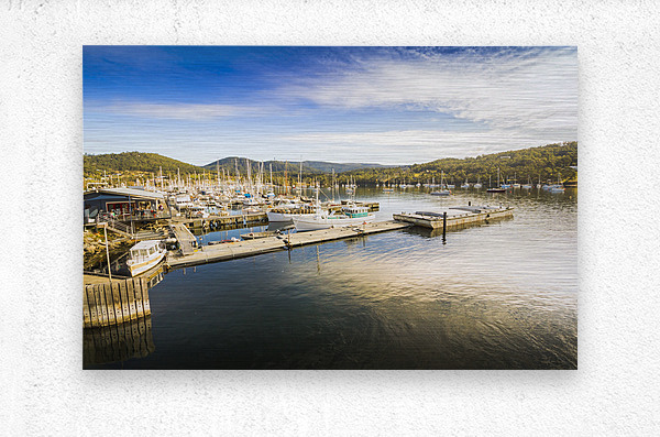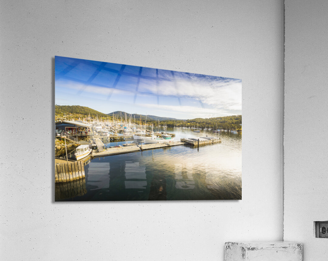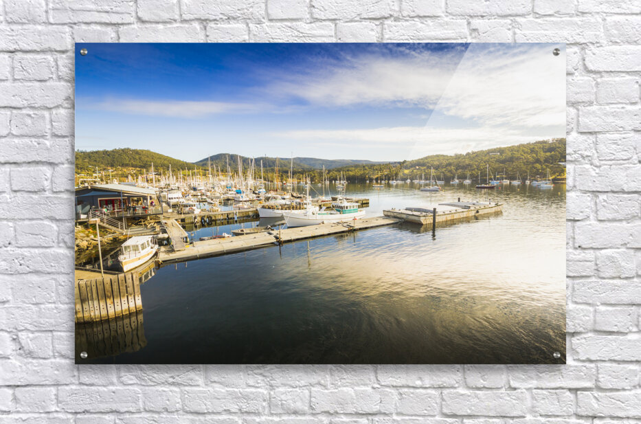 Bright vibrant scene of a pretty blue harbour with cloudy skies and moored boats. Kettering Tasmania Australia