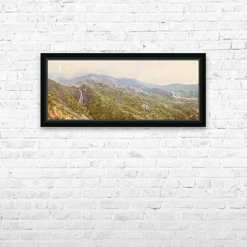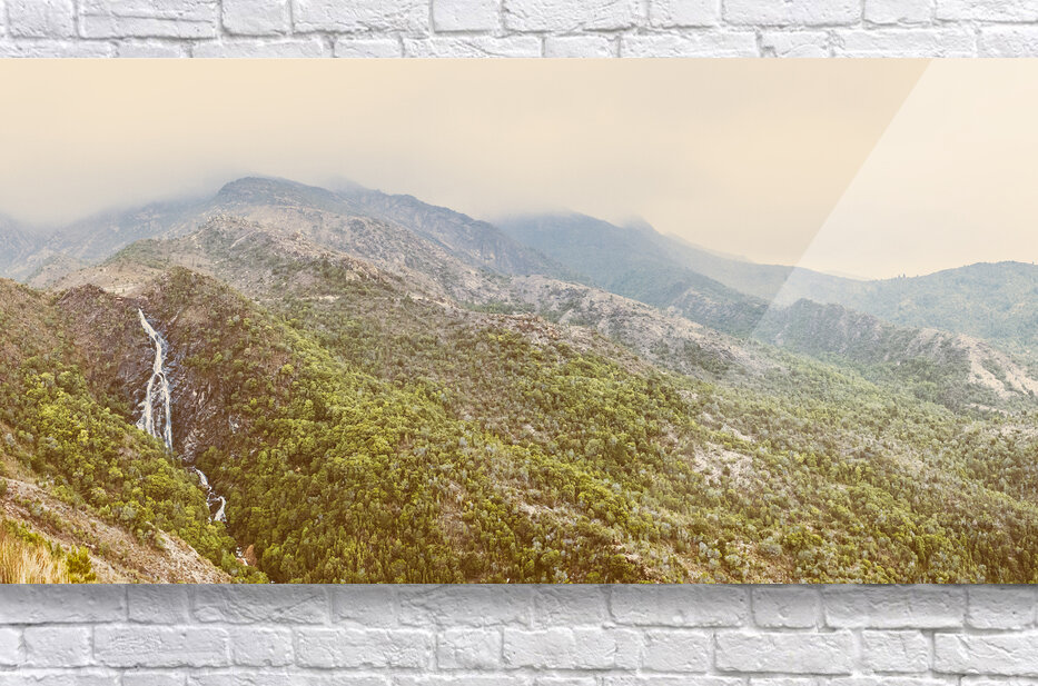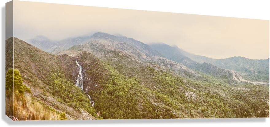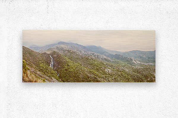 Splendid wide open landscape of country calm with waterfall fog and dreamy mountain expanse. Horsetail Falls Queenstown West Coast Tasmania Australia