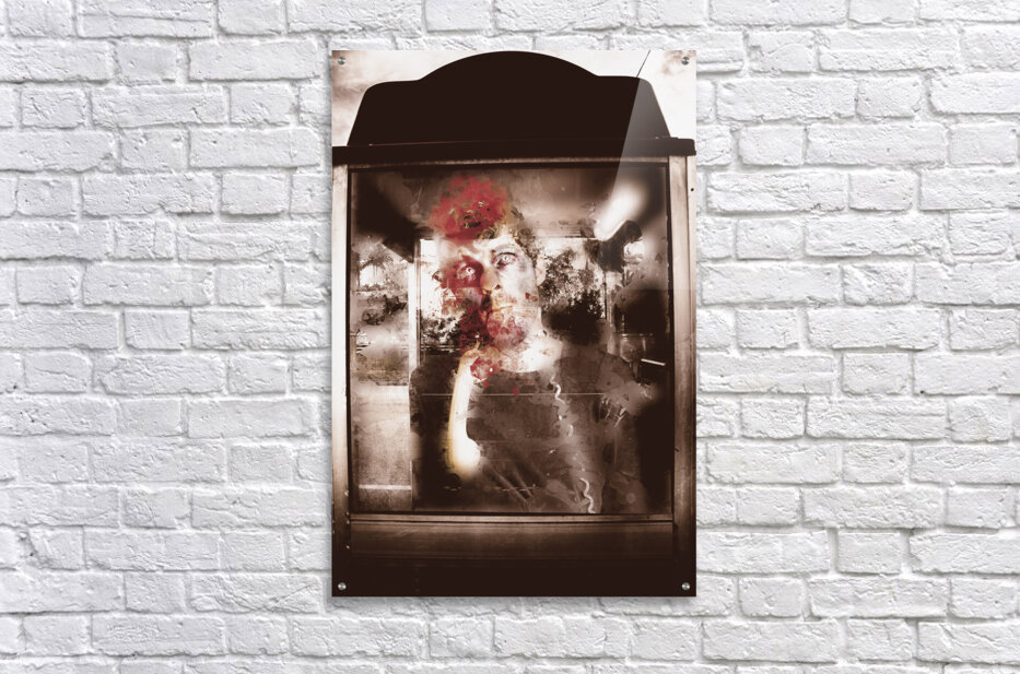 Funny horror portrait of a dead zombie man getting distracted while making a tangled emergency payphone call for help. Help! Itchy ugly face so I ate him... mmmm tasty