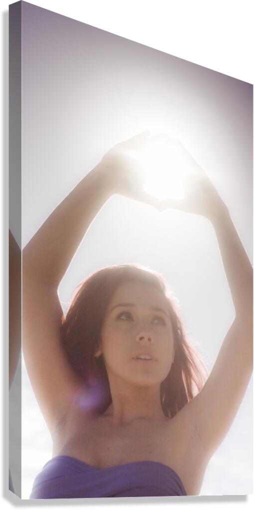 Vintage Portrait Of A Young Woman Holding Hands Up Above Head To Catch Rays Of Sun Light Beaming Down From Heavens Above In A Depiction Of Enlightenme...[+]