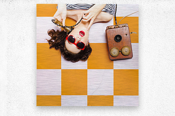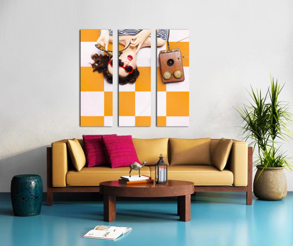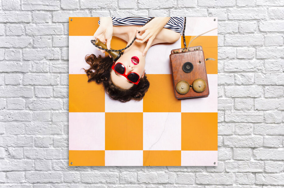Classic pin-up beauty decision making while conversing on a wooden box telephone on yellow and white retro tiles. Indecisive musings