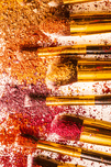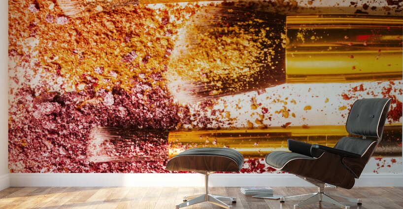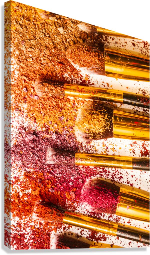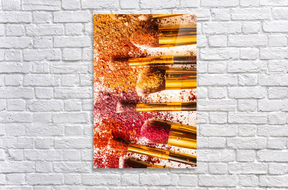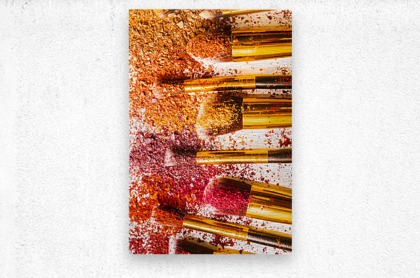 Creative makeup composition on a colorful layout of foundation powders and brushes. Powderised