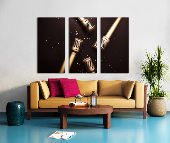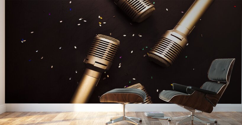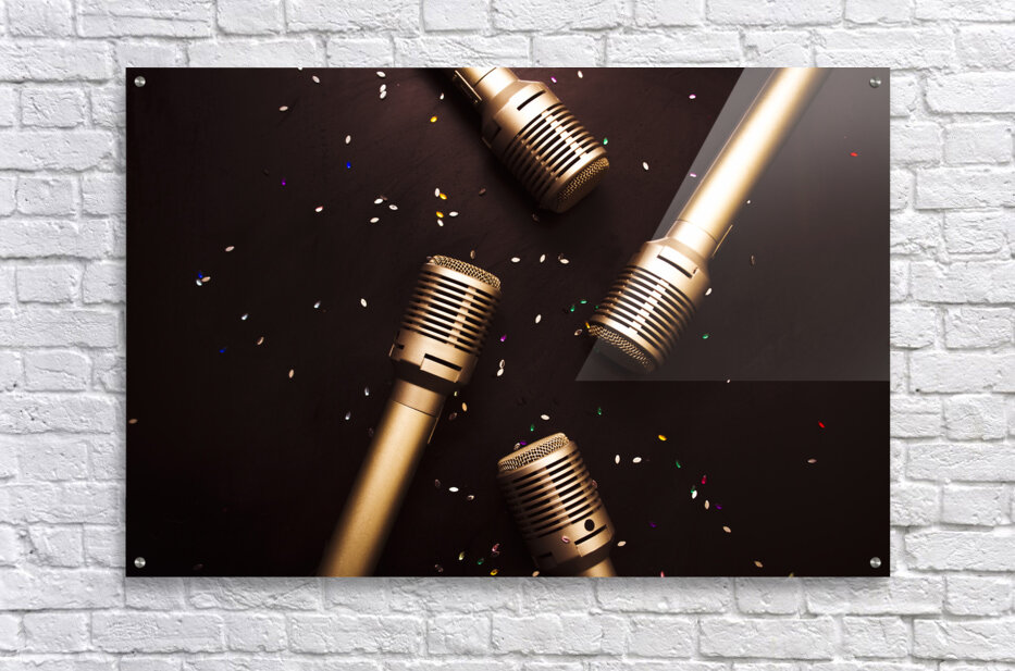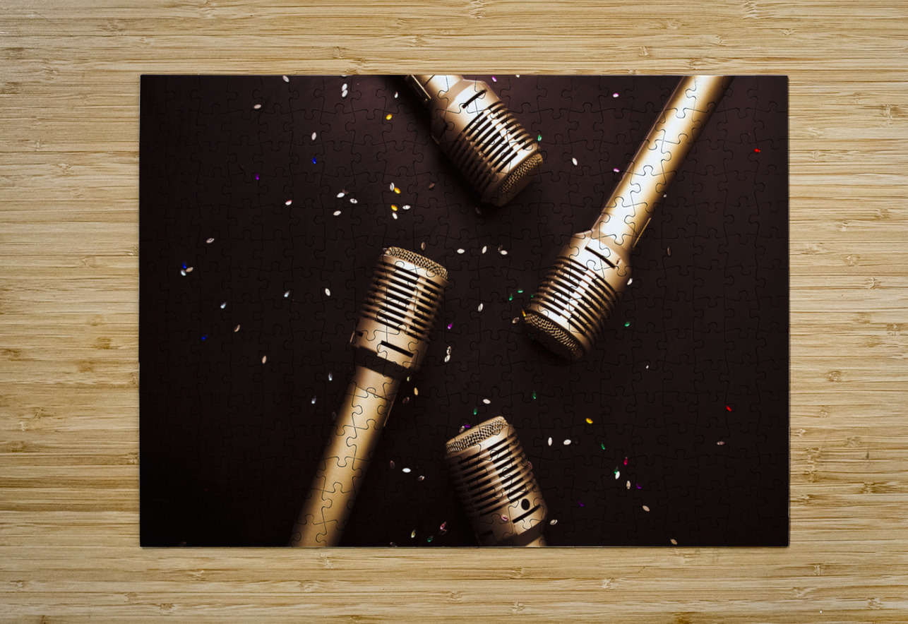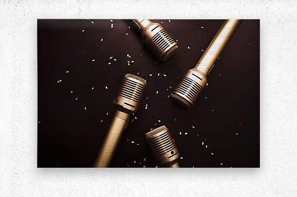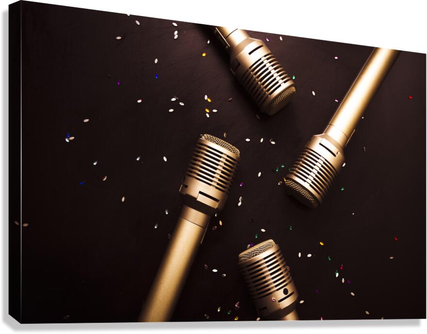 Creative still-life art on a 4 way confetti covered microphone party. A showtime scene