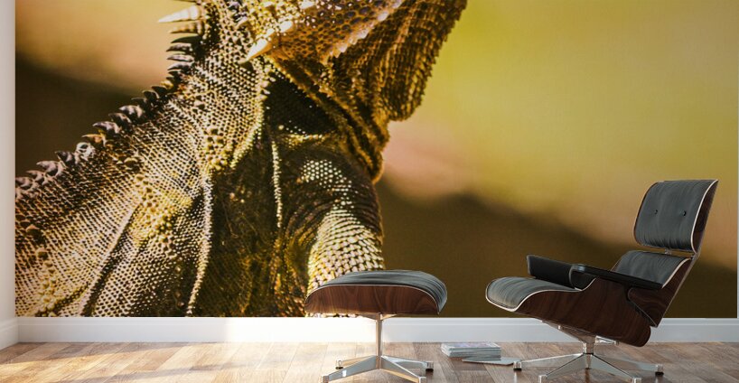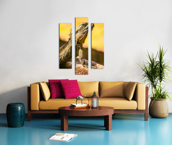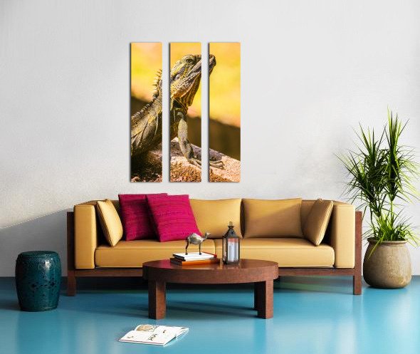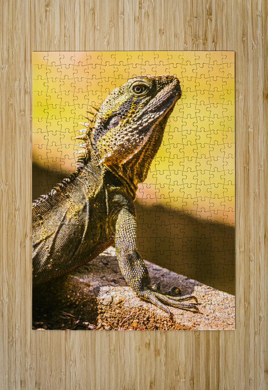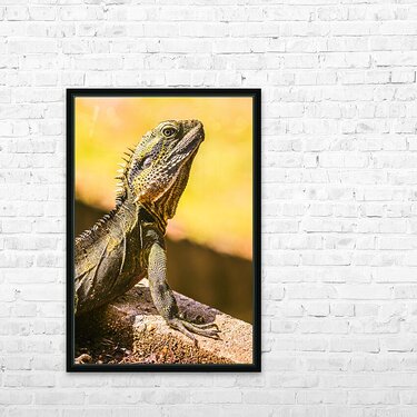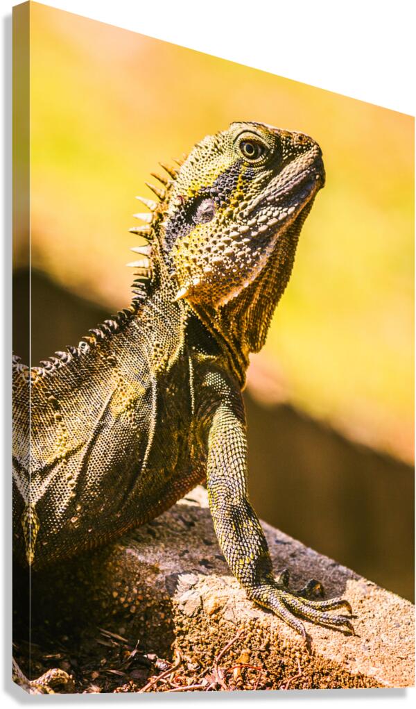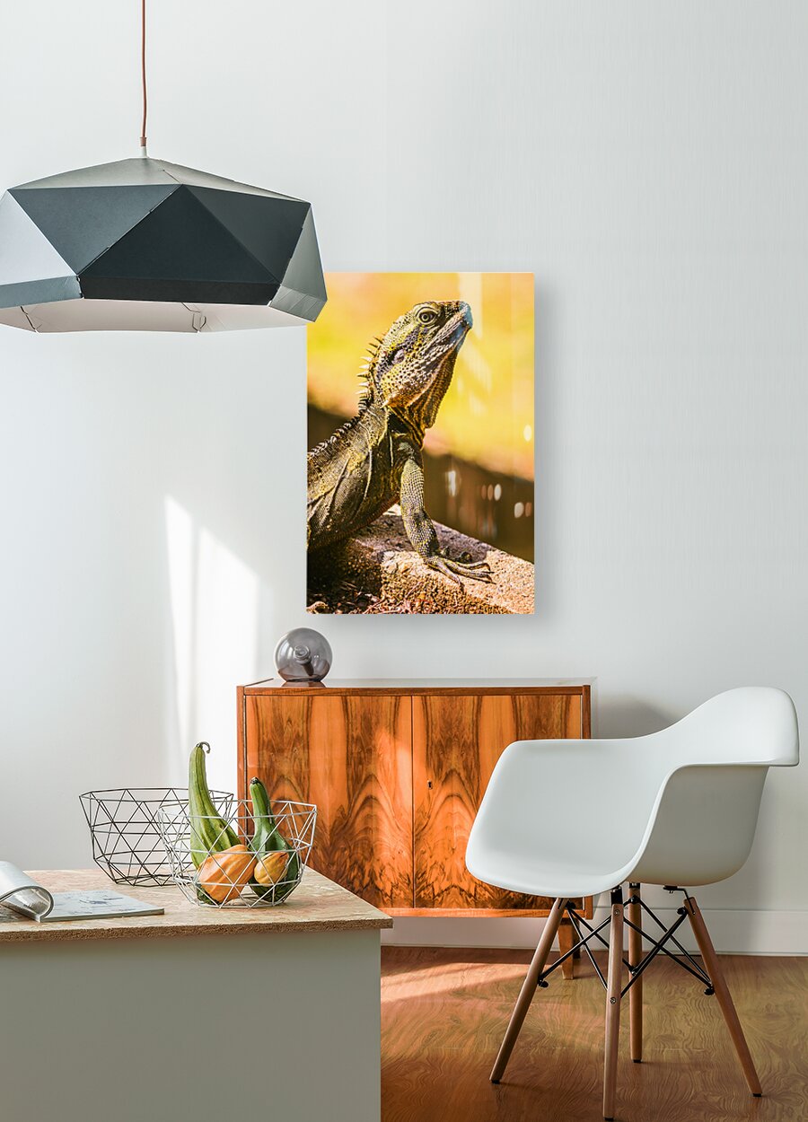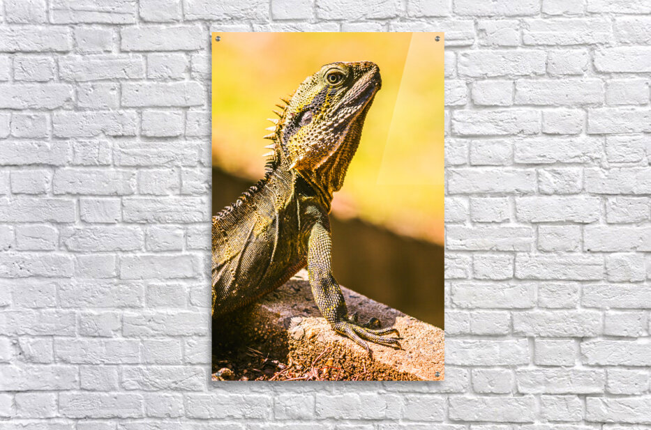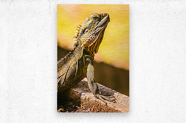 Nature photography on a wild Eastern Water Dragon Lizard standing watchful before a golden afternoon sunset. Brisbane Queensland Australia