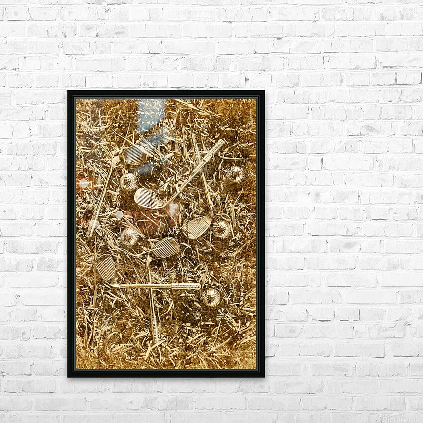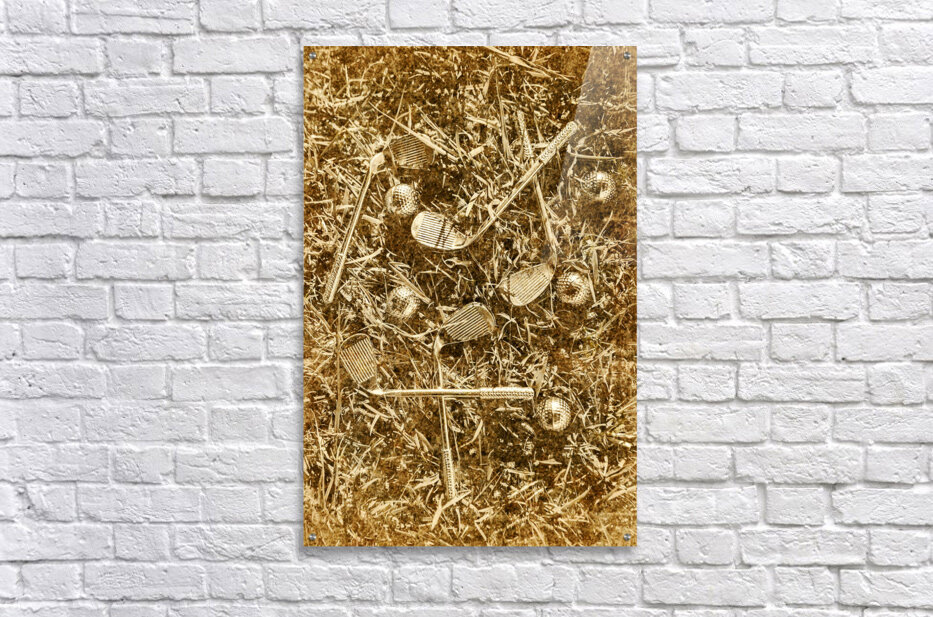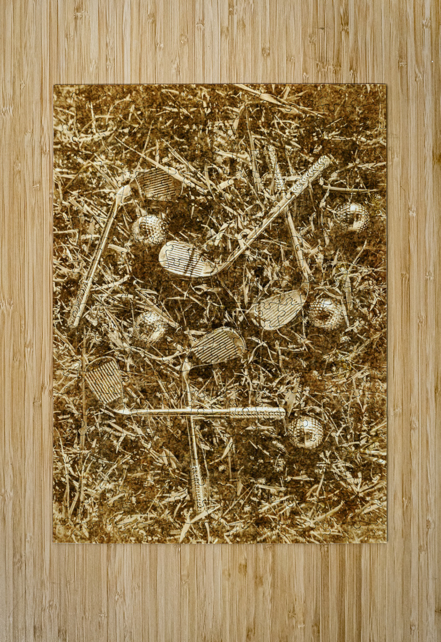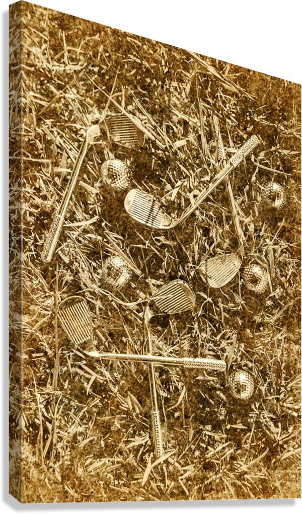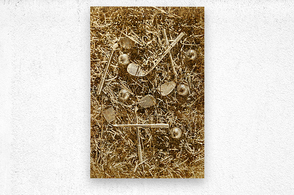 Vintage golfer art on a pile of miniature toy golf clubs nestled in an old course green. The art of golf