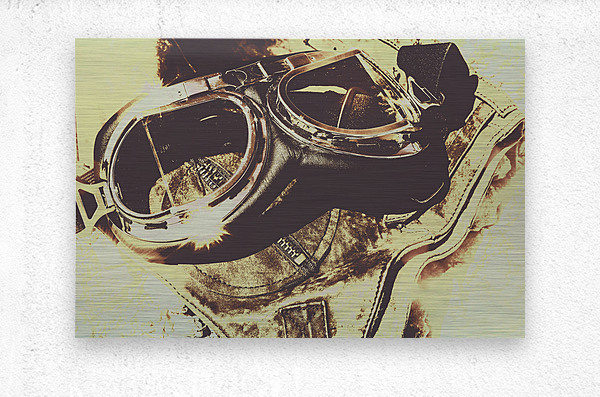 Vintage aviation object photography on a leather fighter pilot cap and goggles in worn faded fashion. Retro pilots still life