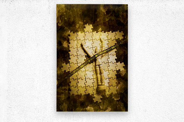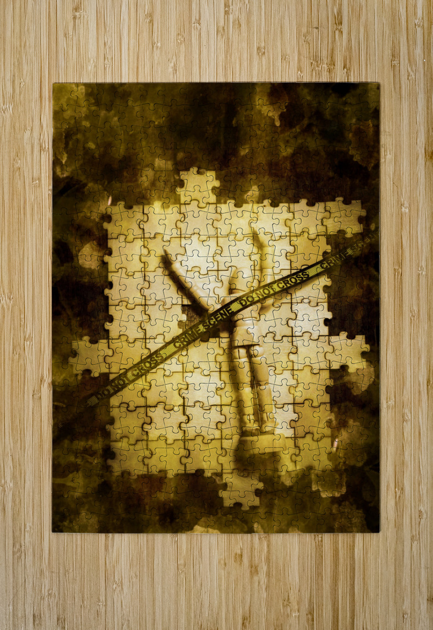Creative still life art on a conspiracy of unsolved justice with a john doe figurine on a missing puzzle of investigative murder