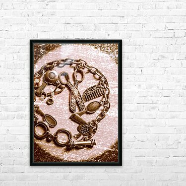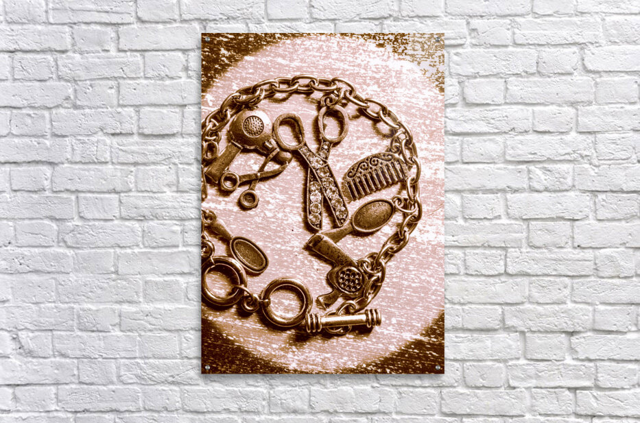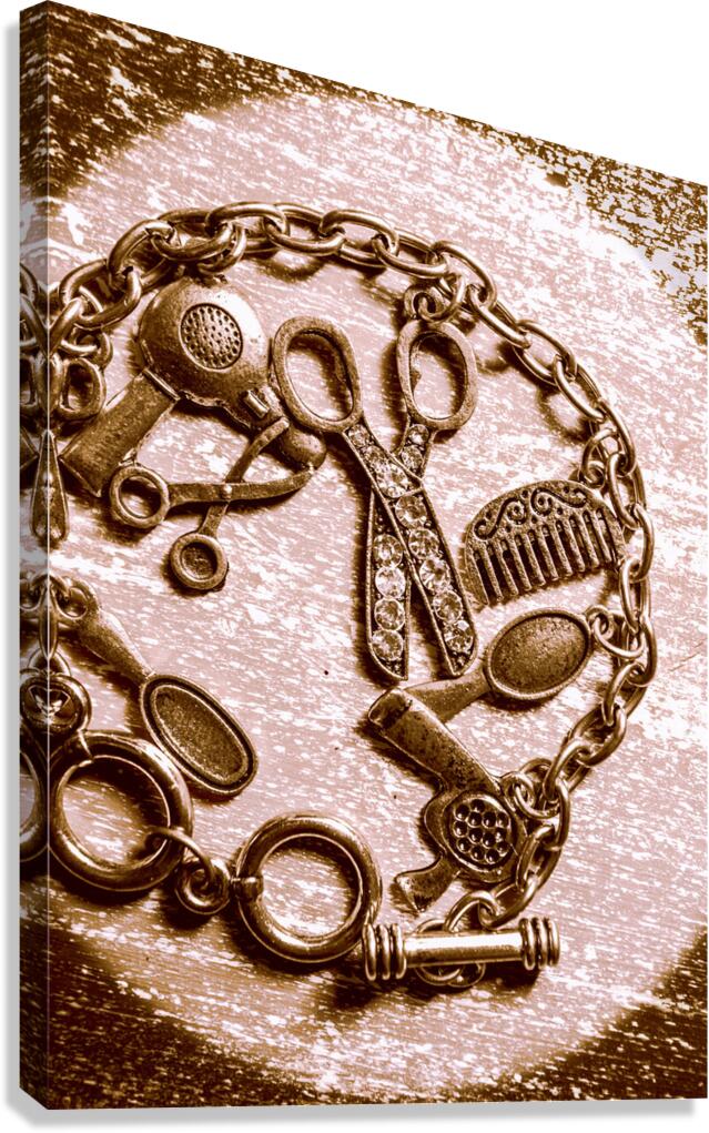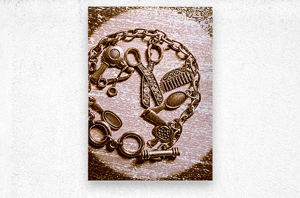 Vintage hairdressing tool kit with various hairdresser jewls fastened to wrist chain retro beauty concept