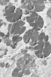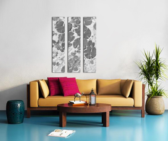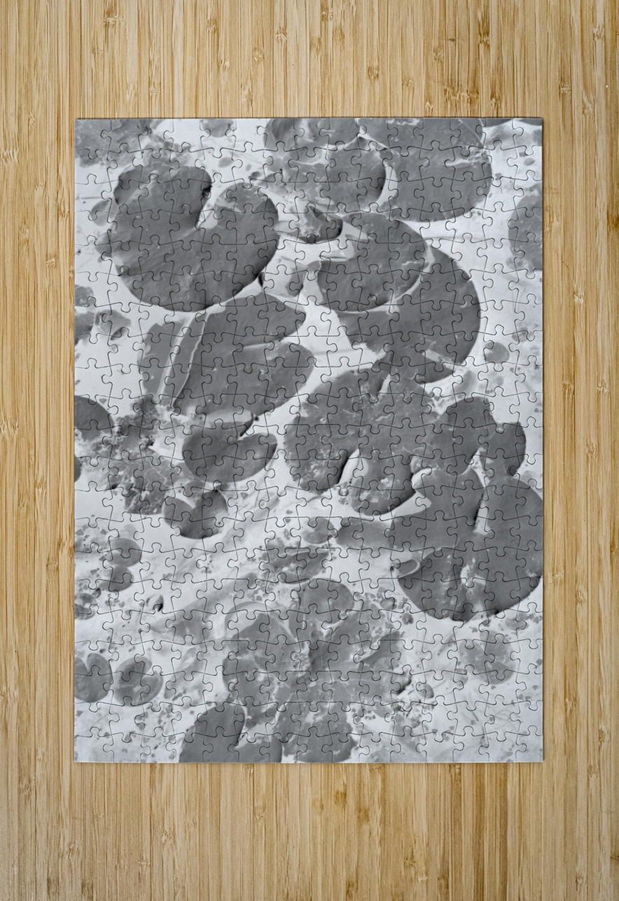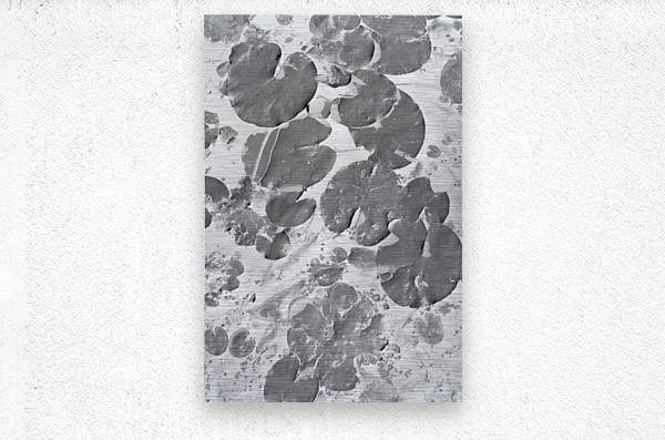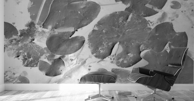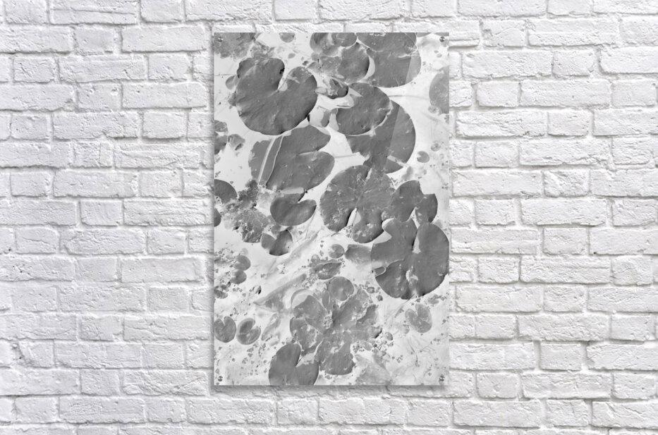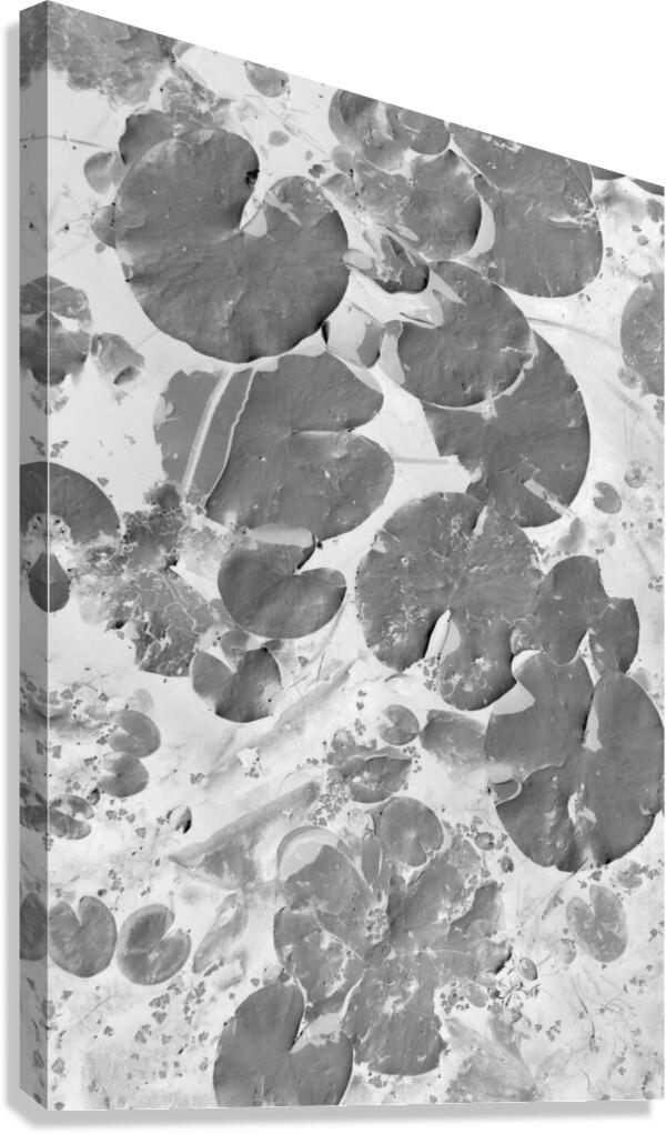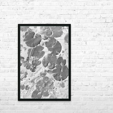 Black and white art on a aquatic scene of lilly pad lakes in floating abstraction