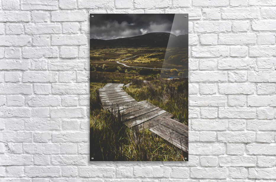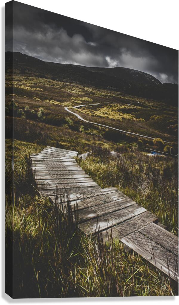 Intense and atmospheric landscape of the Cradle Mountain Overland Track leading off into the darkness of remote bushland. Hiking trails