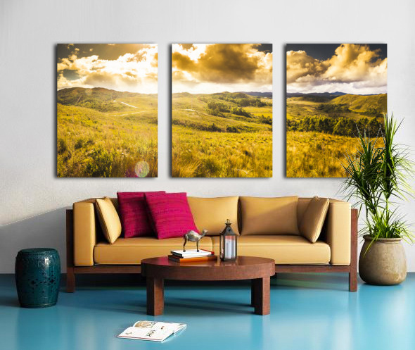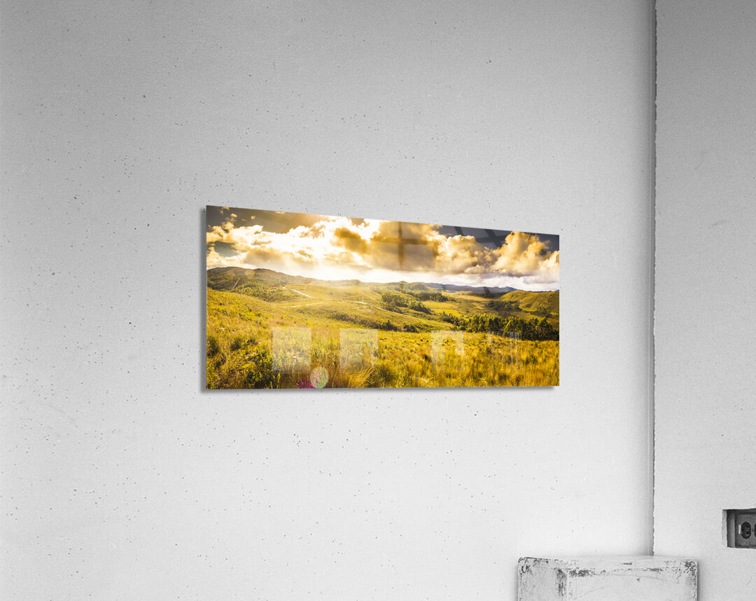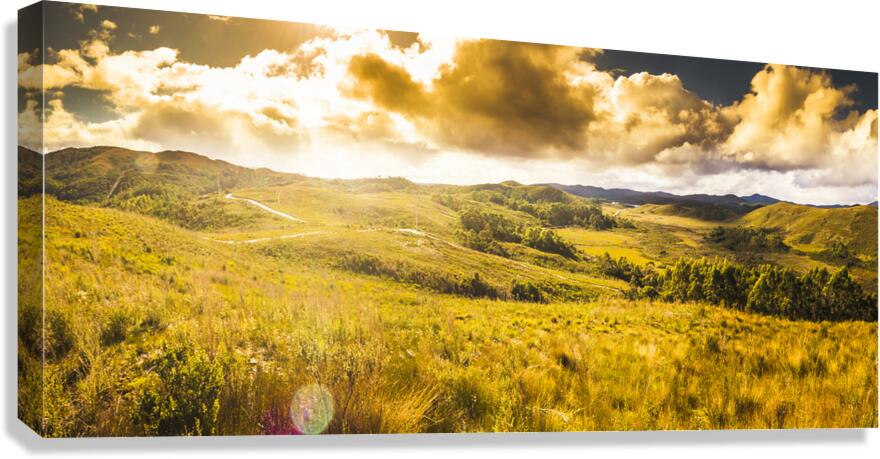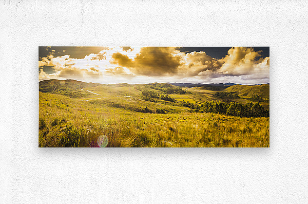 Gorgeous golden sunset field with rain clouds over vibrant yellow countryside. Zeehan Tasmania Australia