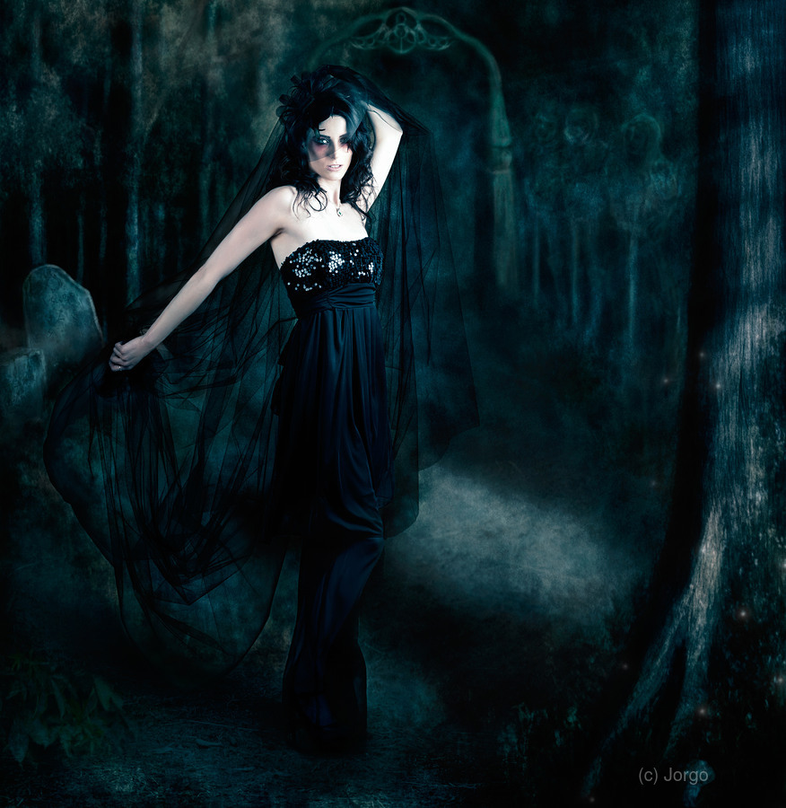 Moody atmospheric portrait of an elegant mysterious woman posing in a black evening gown amongst the shadows of darkness