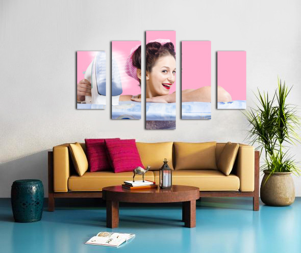 Get this artwork "Smiling housewife doing housework laundry duties" in a framed print.