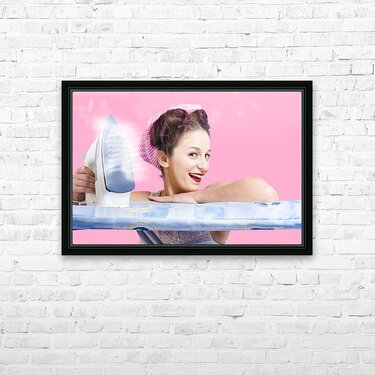 Smiling housewife doing housework laundry duties Picture Frame Printing