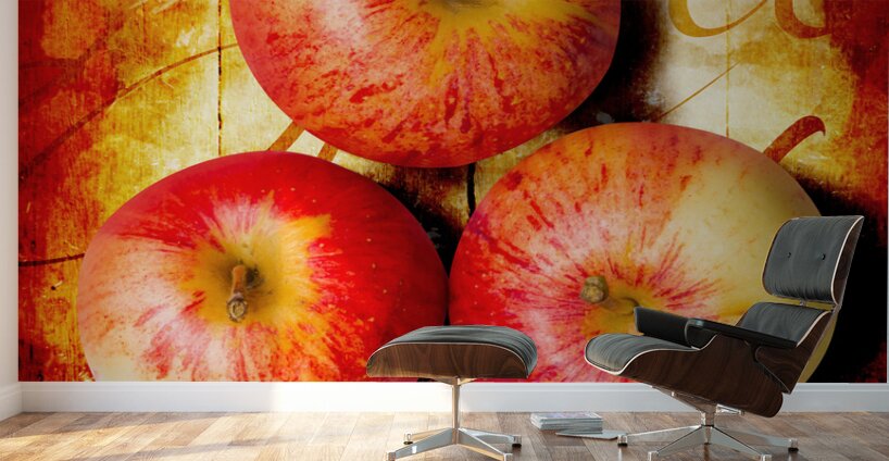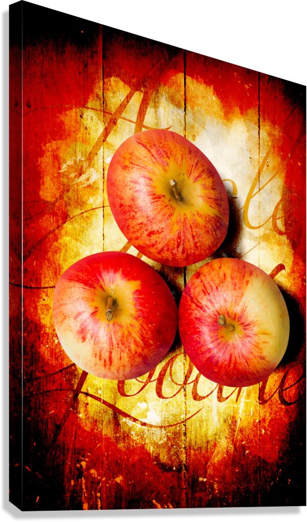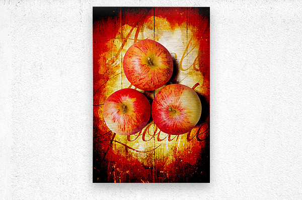 Top down view on three raw whole honeycrisp type apples on wood surface with cursive text. Apple barn artwork