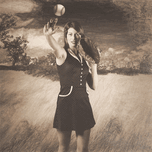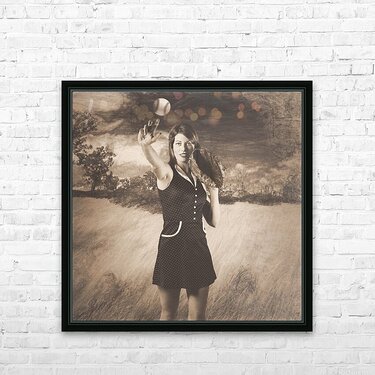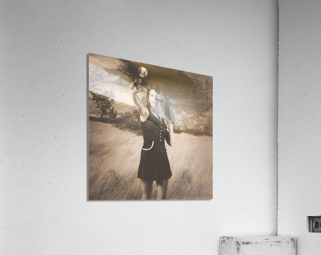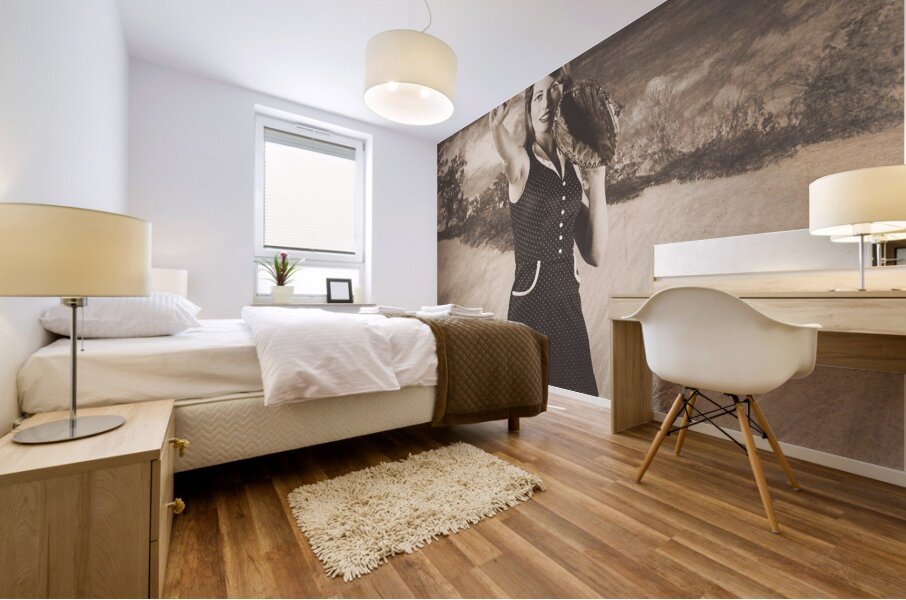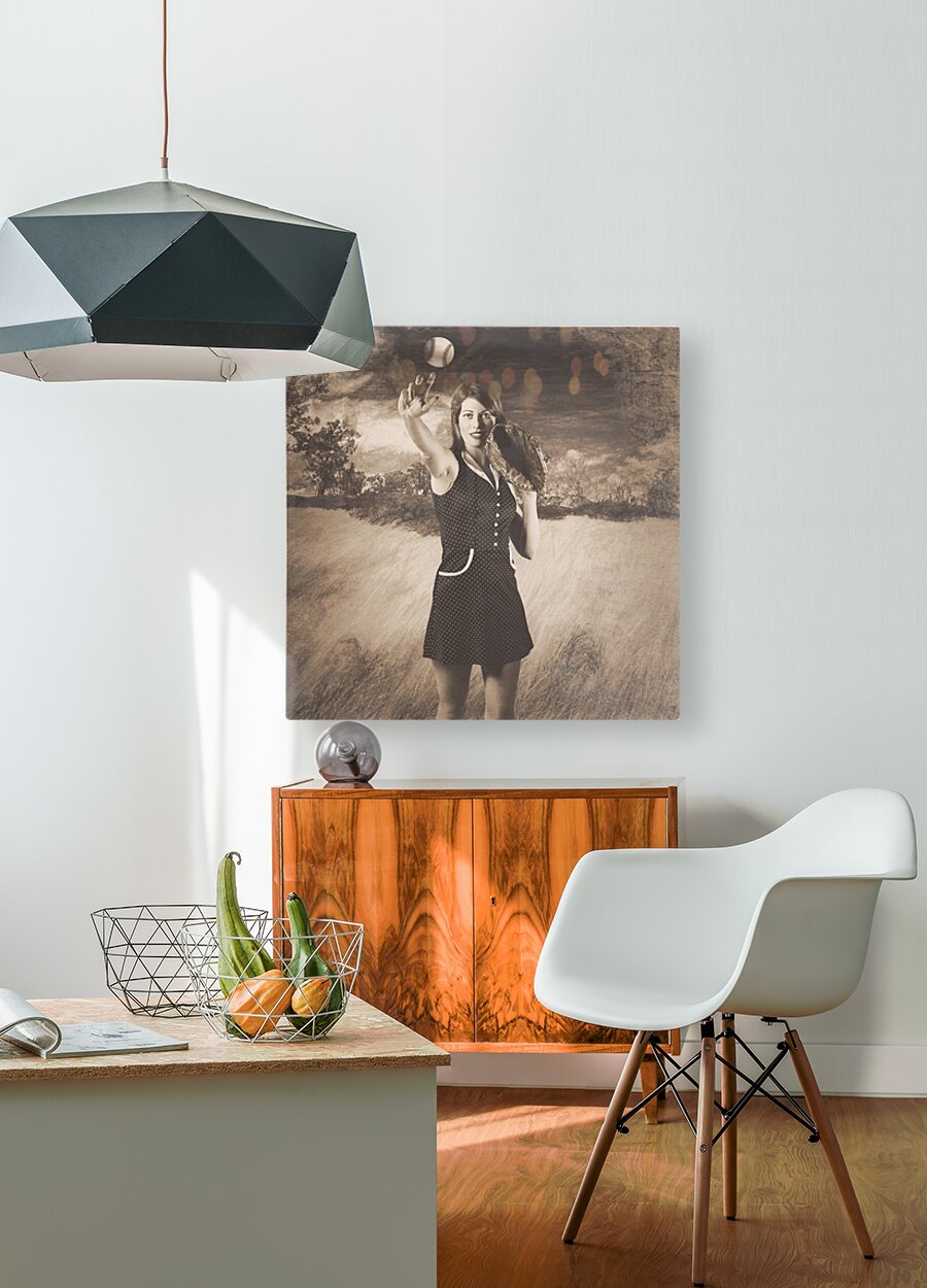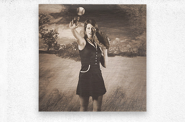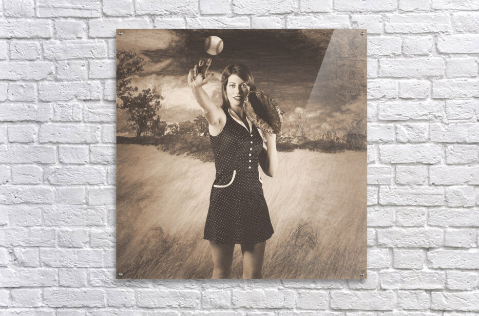 Vintage pinup fine art photo of a baseball girl pitching ball in nostalgic field with base ball mitt on illustration background. Field of dreams