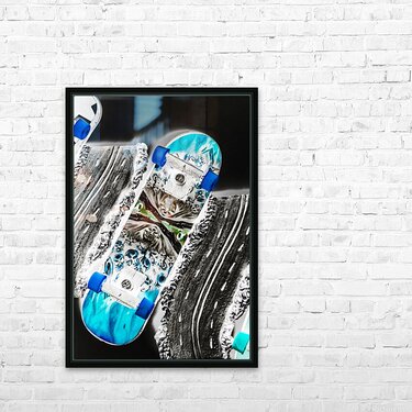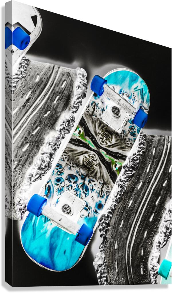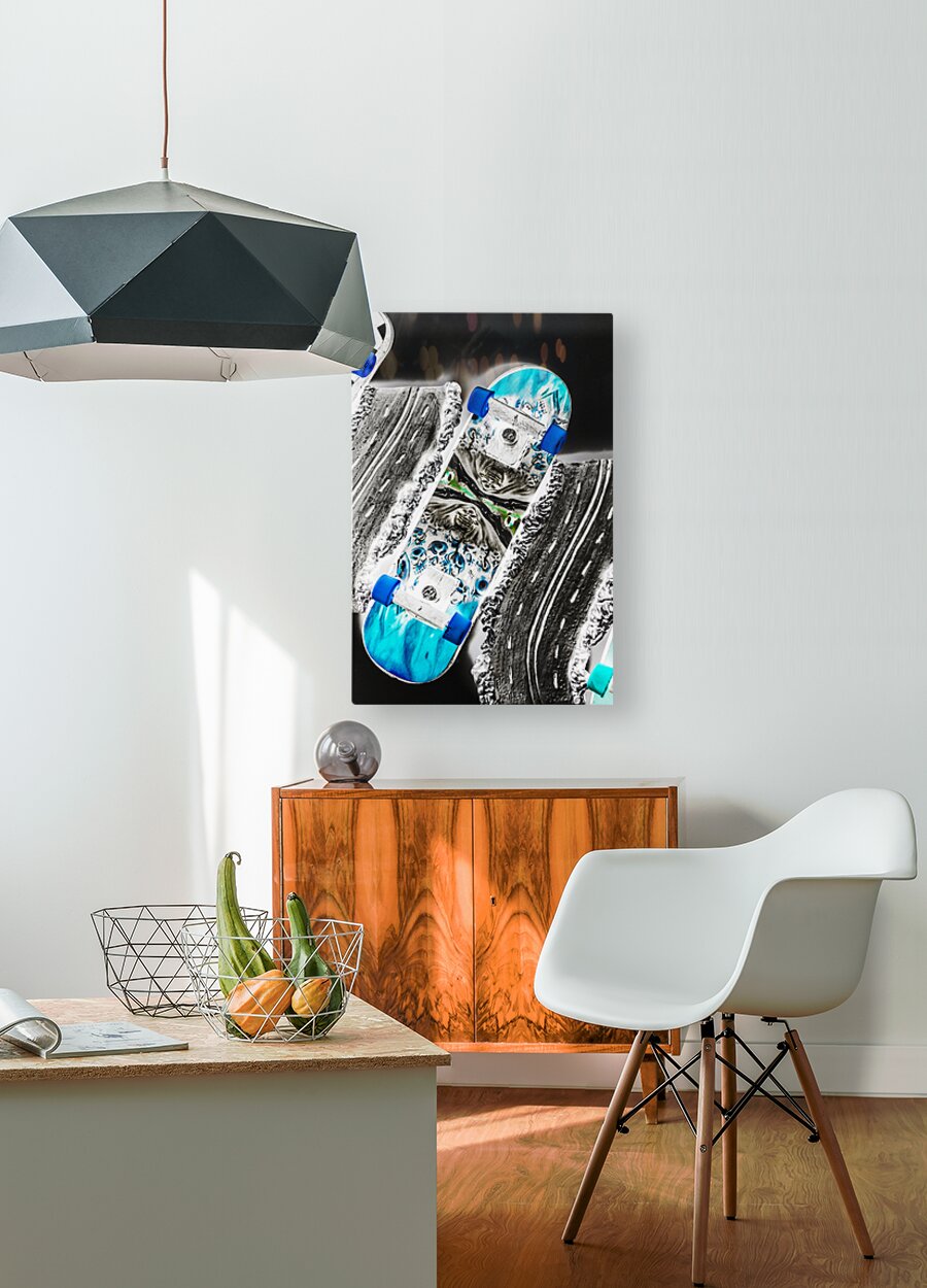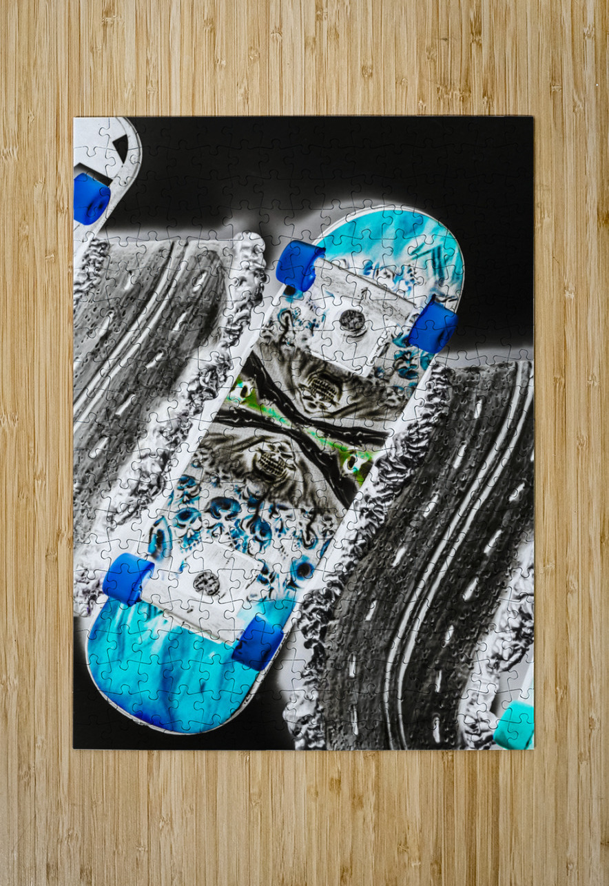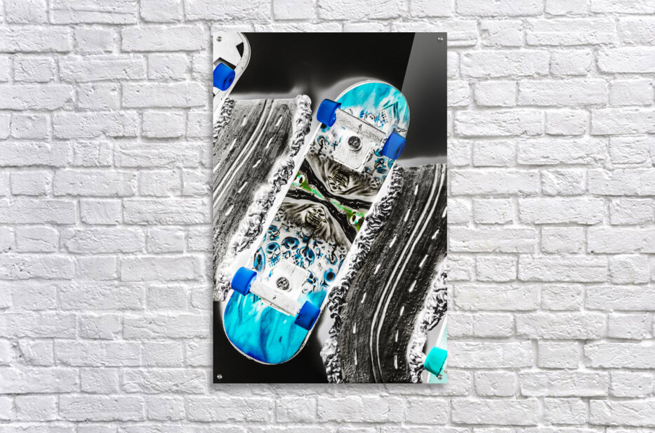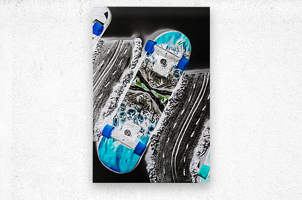 Still life artwork on a blue skateboard deck next to bitumen roads. Urban tracks