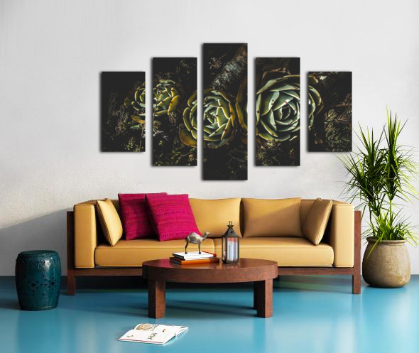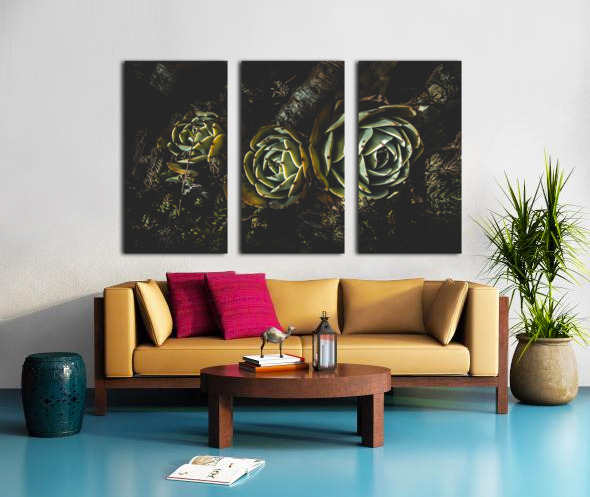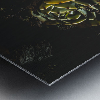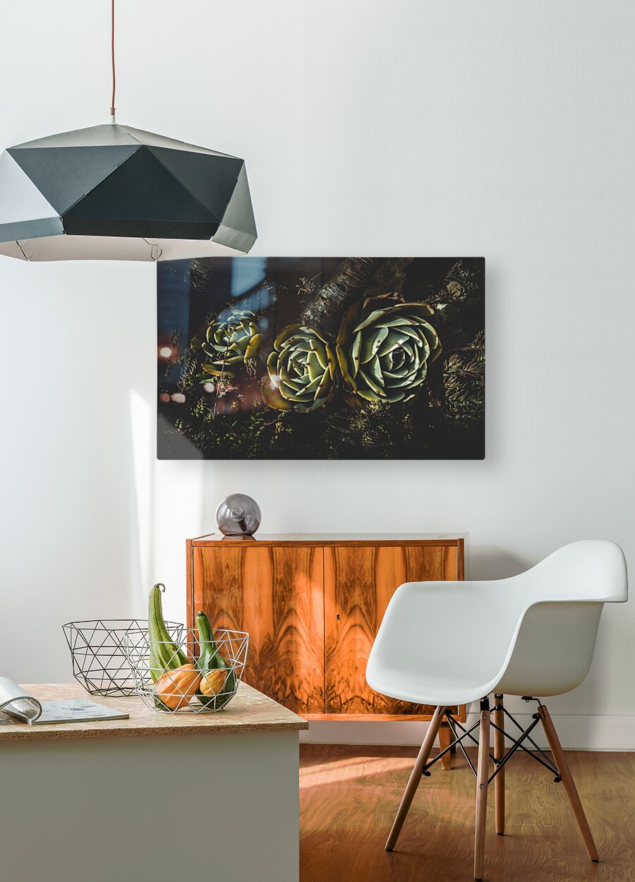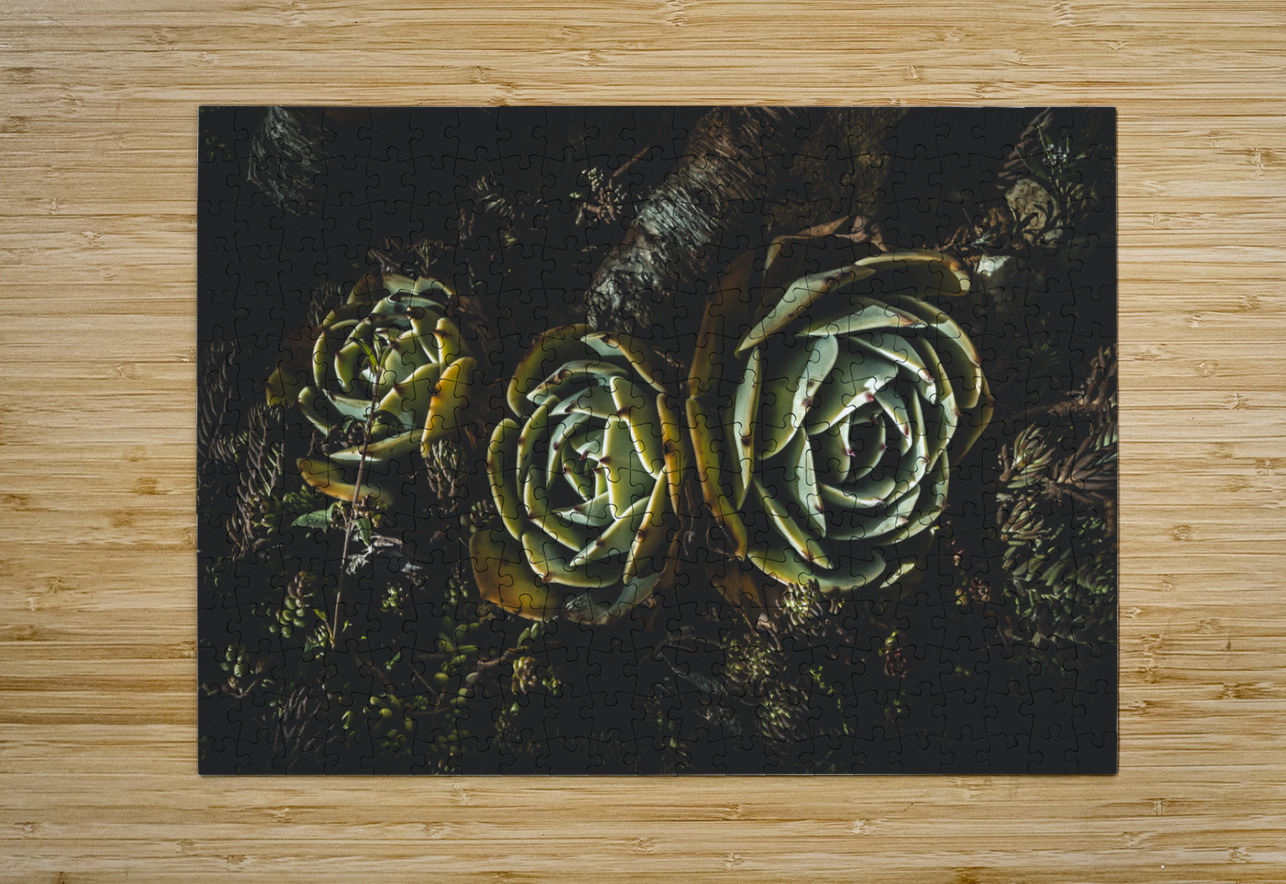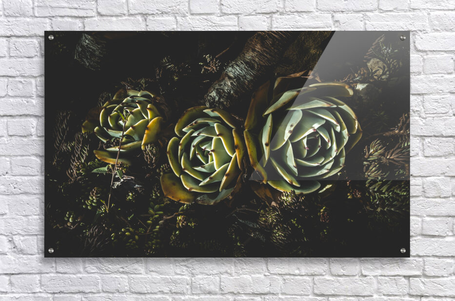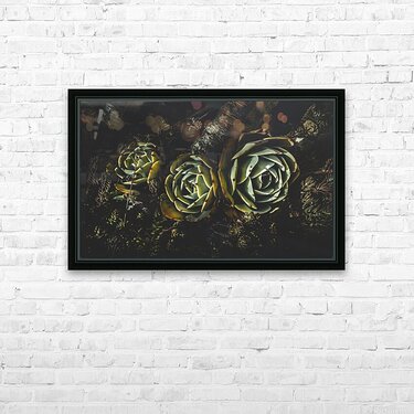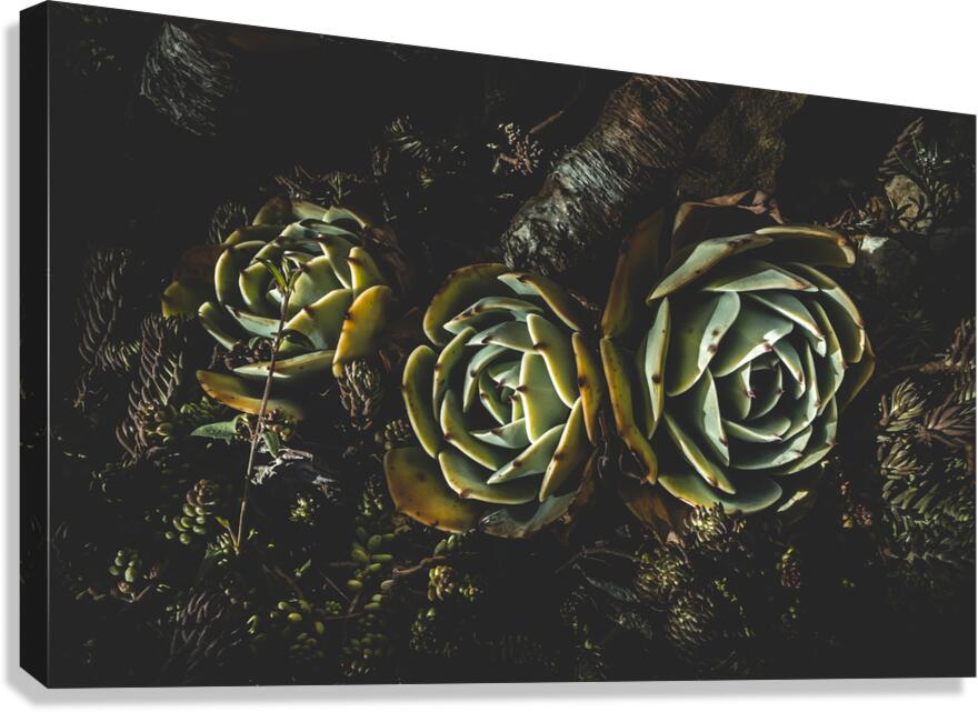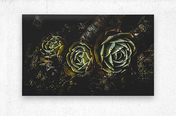Dark creative photo on three Australian Succulent Plants resembling flowering cactuses in the cold night of a Tasmanian winter. In dark bloom