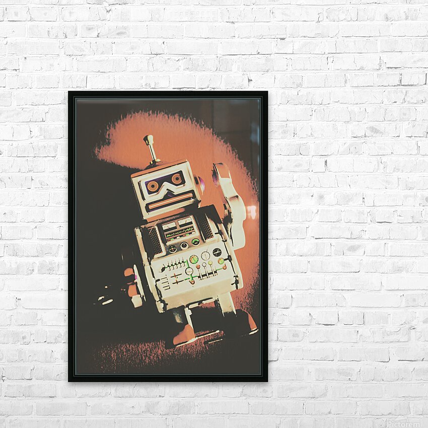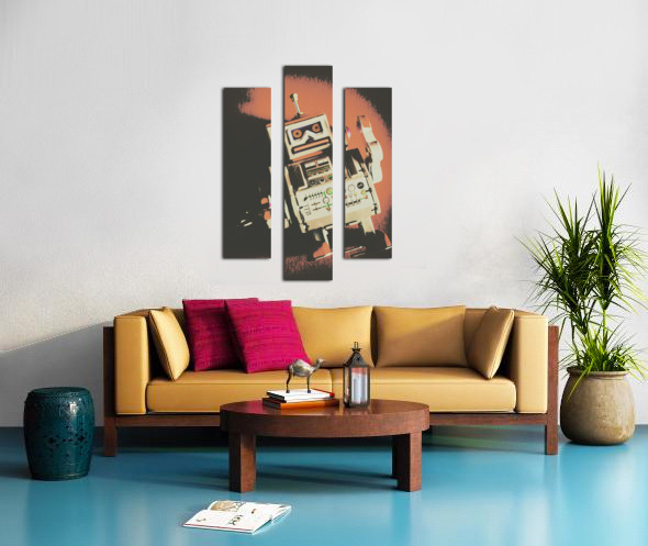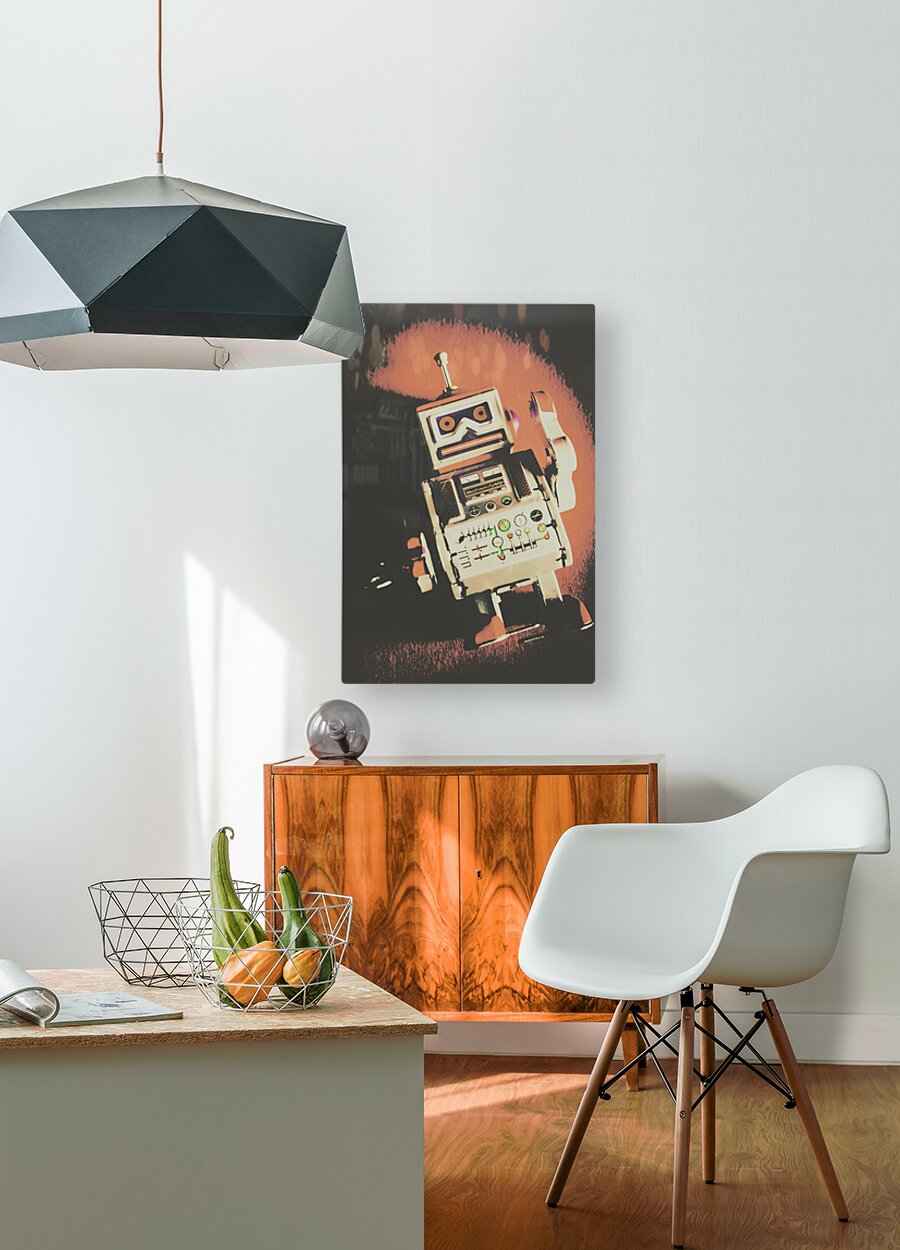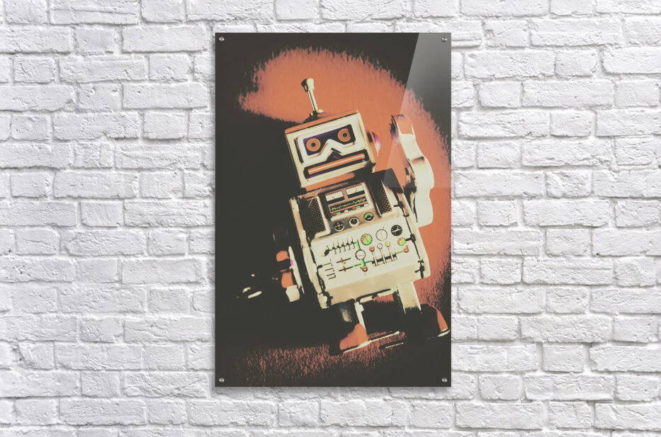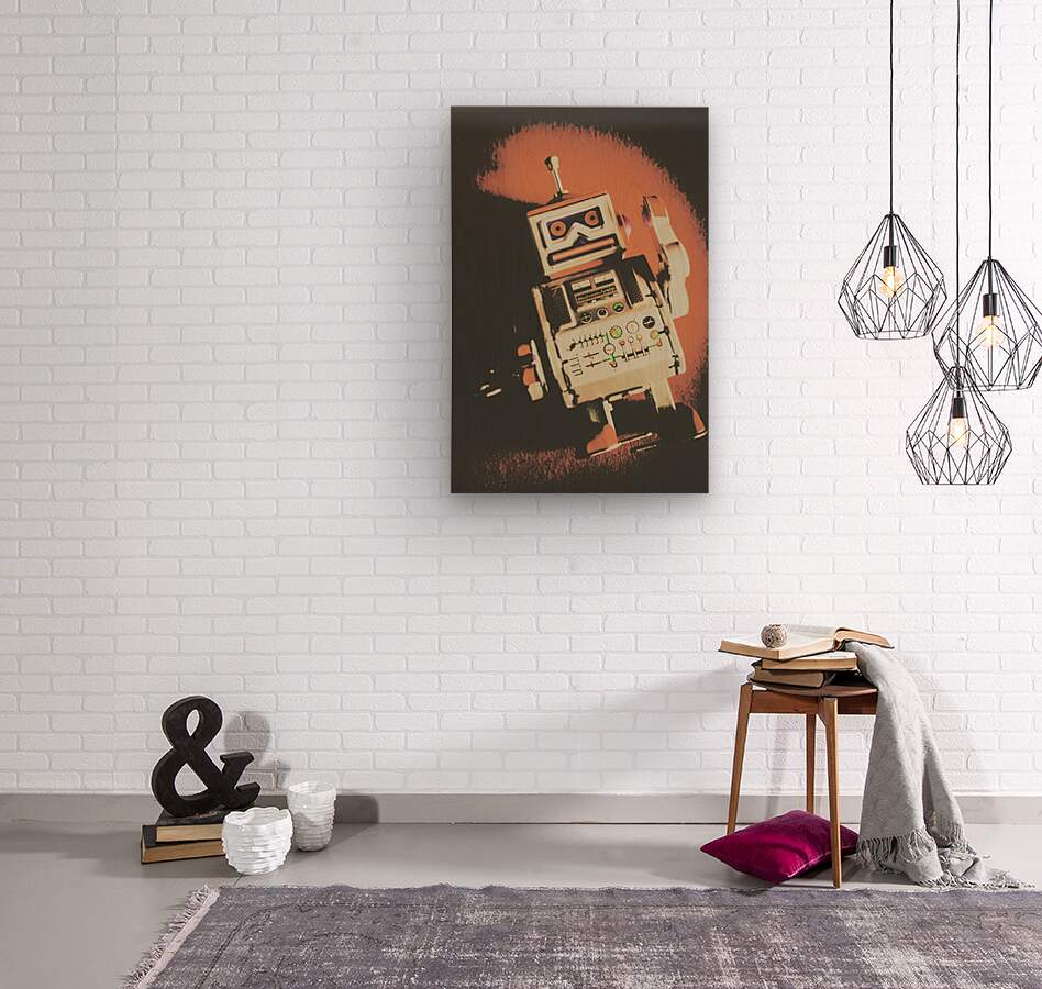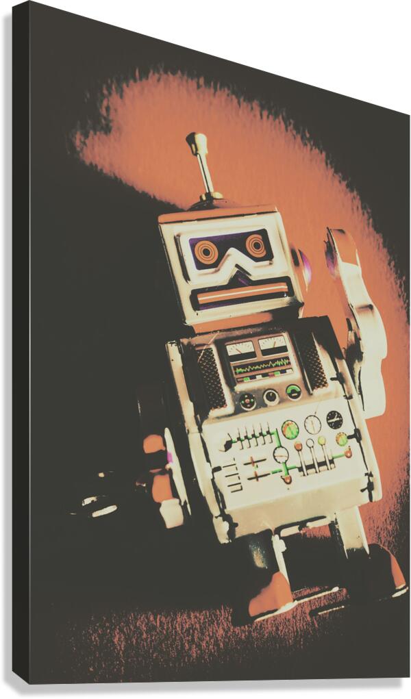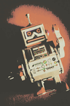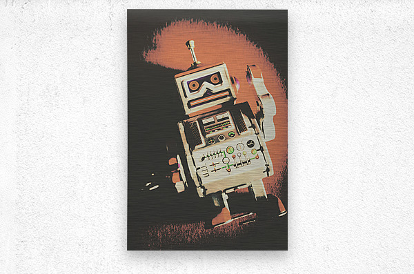 Error 404 in the design of a malfunctioned broken retro tin robot in posterised form. Android short circuit