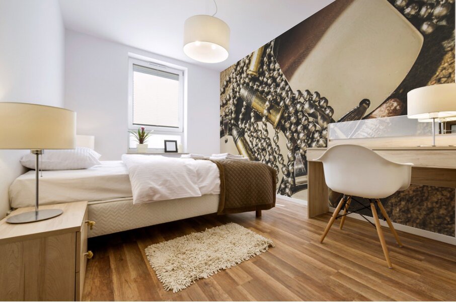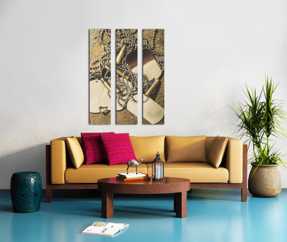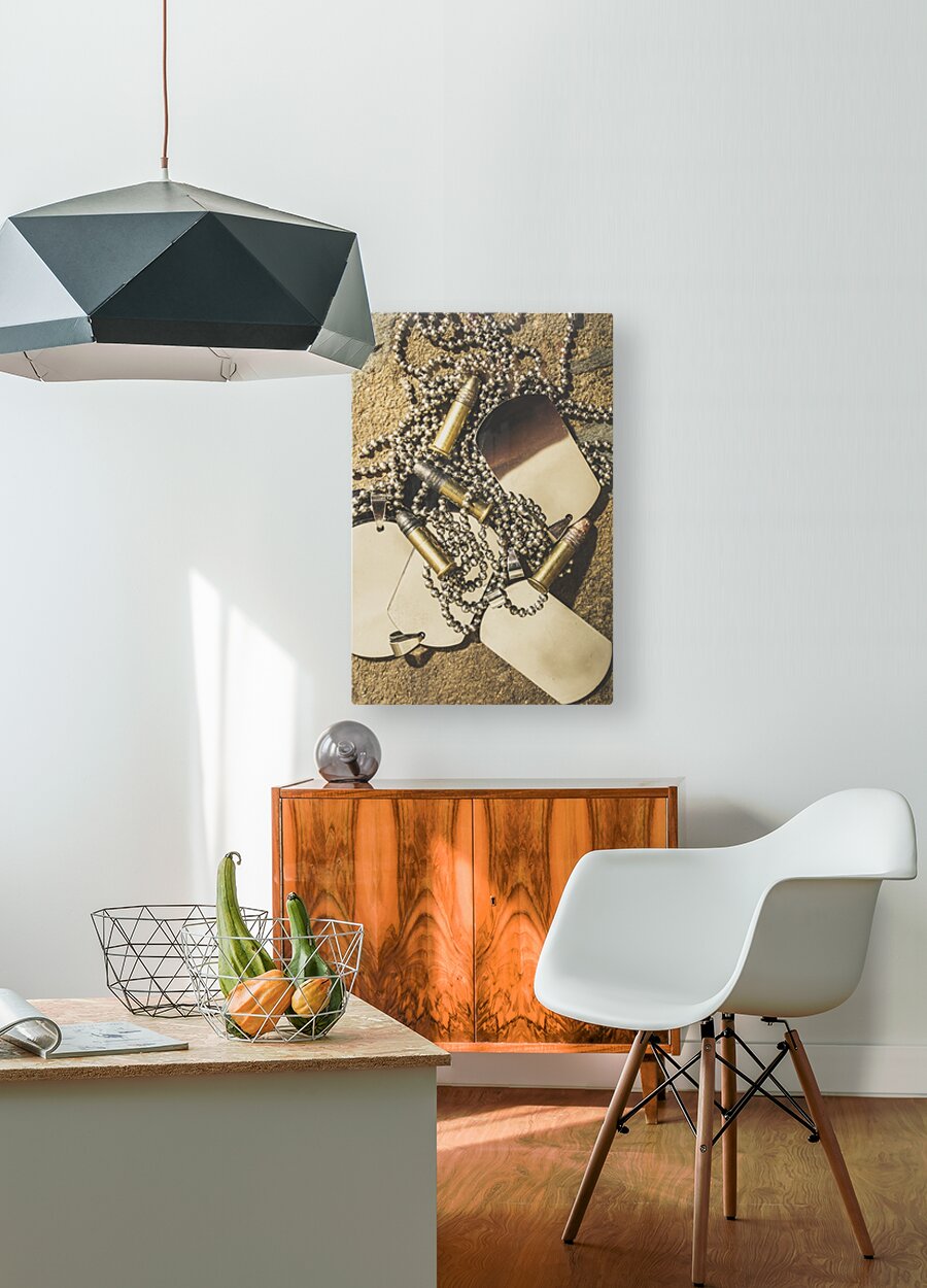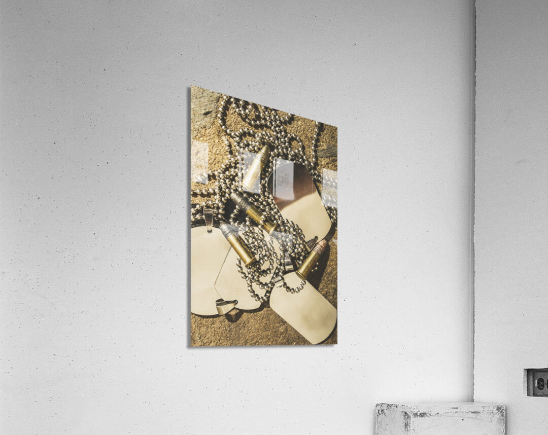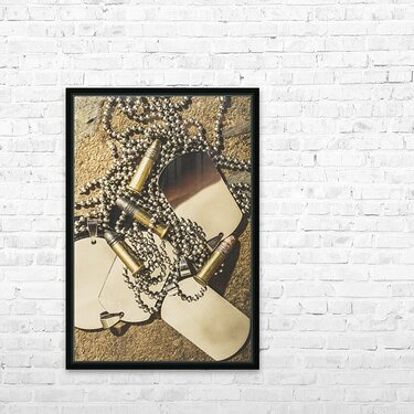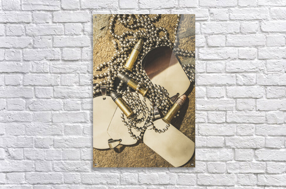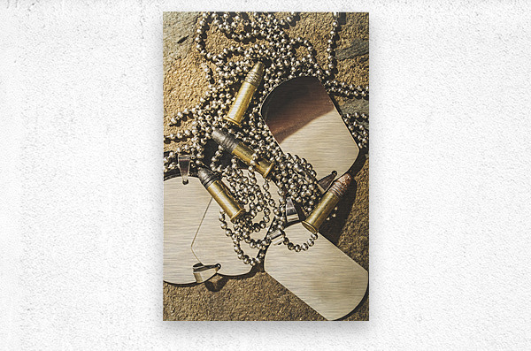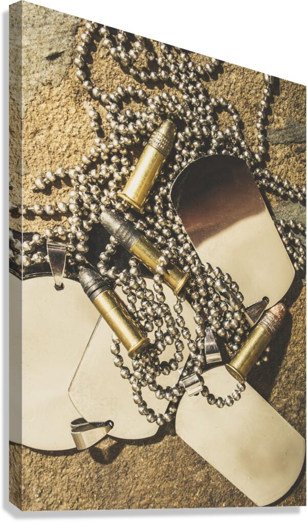 Antique war art on faded rounds of .22 caliber bullets and military dog tags. Reflections of battle