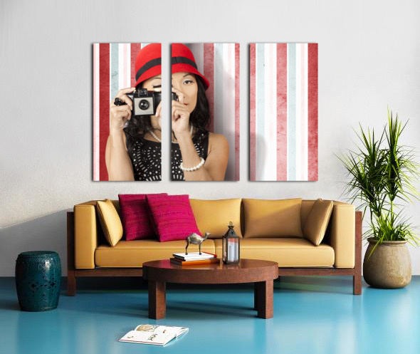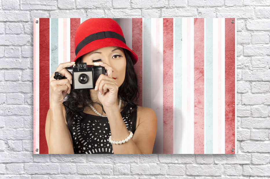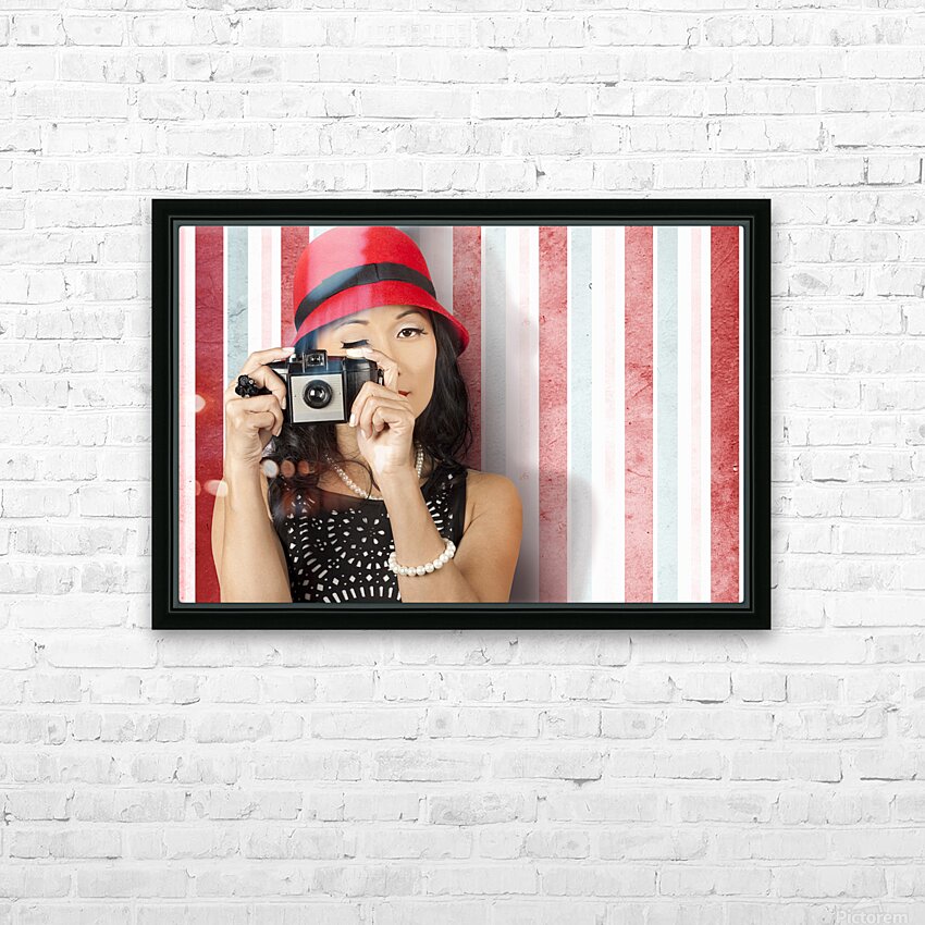 Pin-up photographer in 40s fashion holding camera Picture Frame Printing