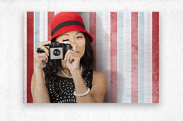 Glamorous pin-up photographer girl wearing red hat and pearl jewellery holding retro film camera in 40s fashion. Focus on copyspace