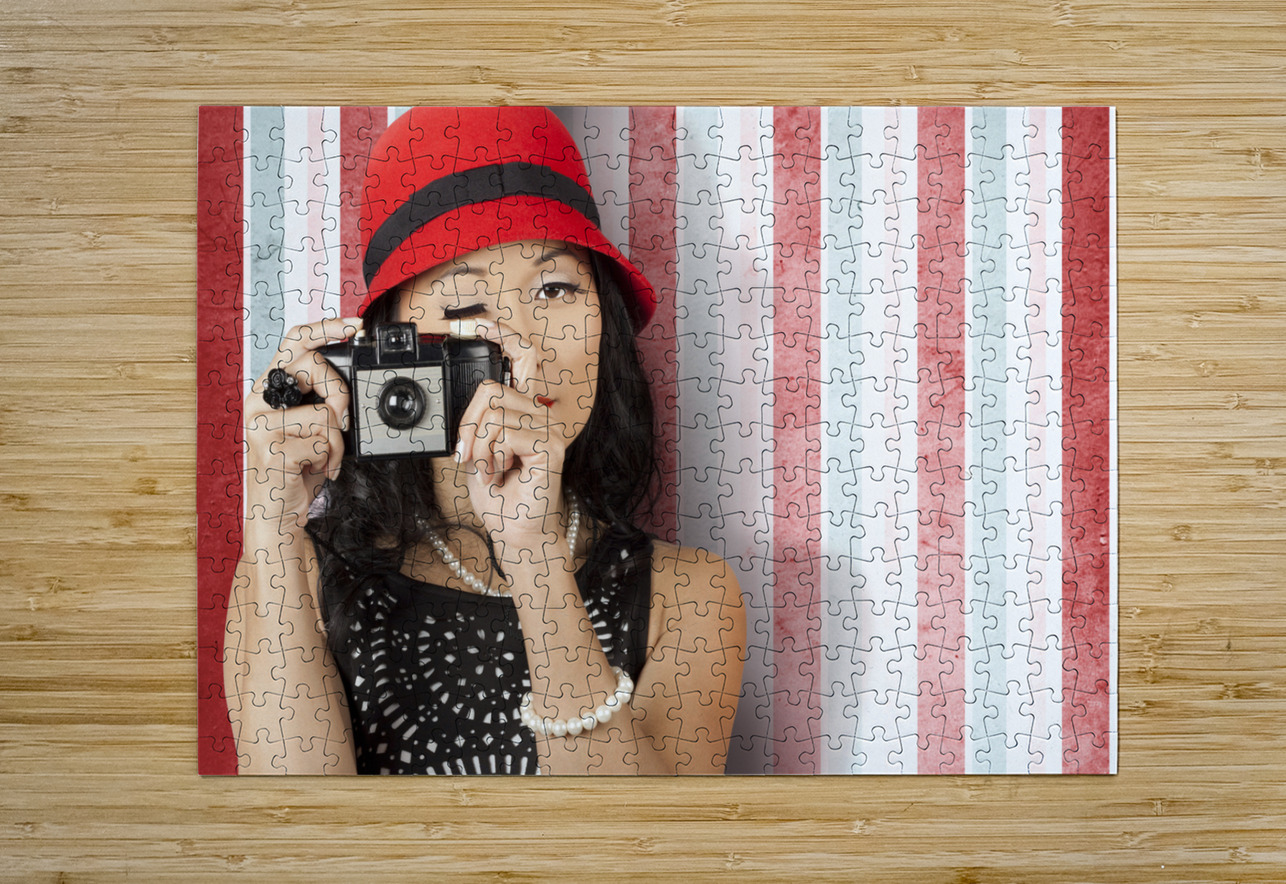 Pin-up photographer in 40s fashion holding camera Jorgo Puzzle printing