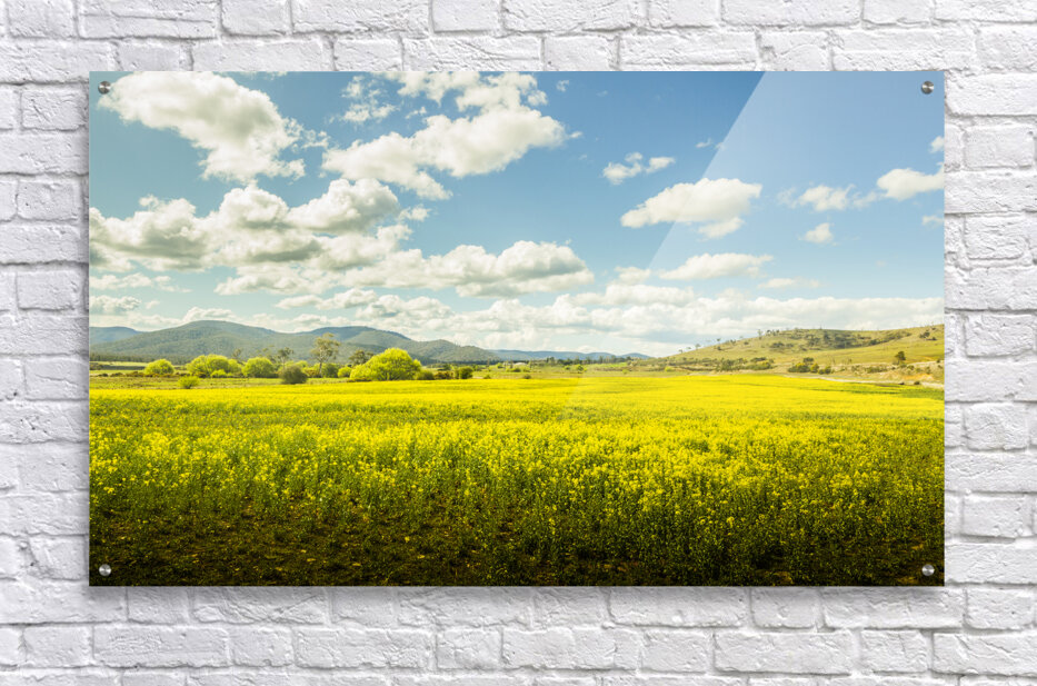 Vibrant country scene on a spring field of seeded agricultural farmland. Ormley Tasmania Australia