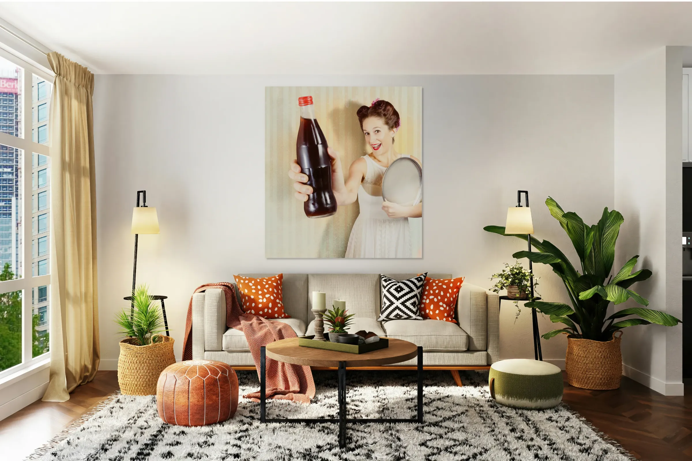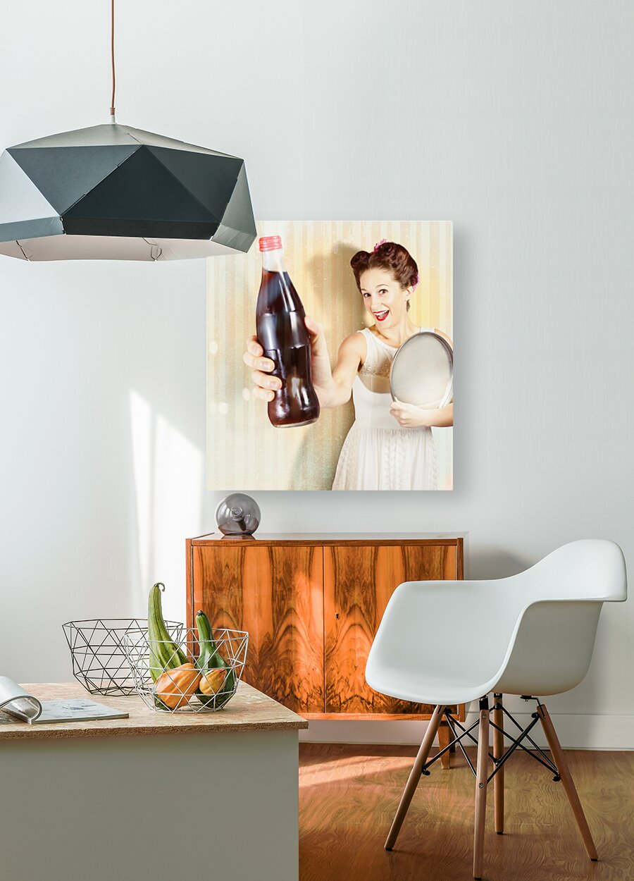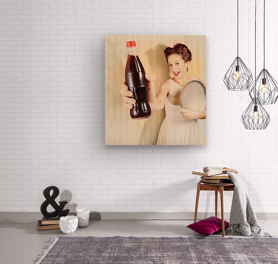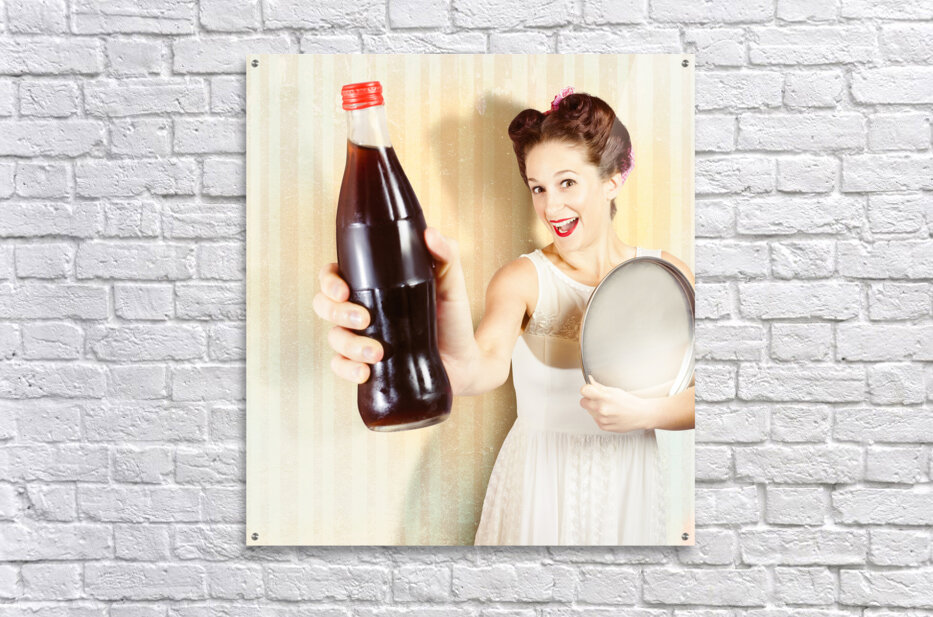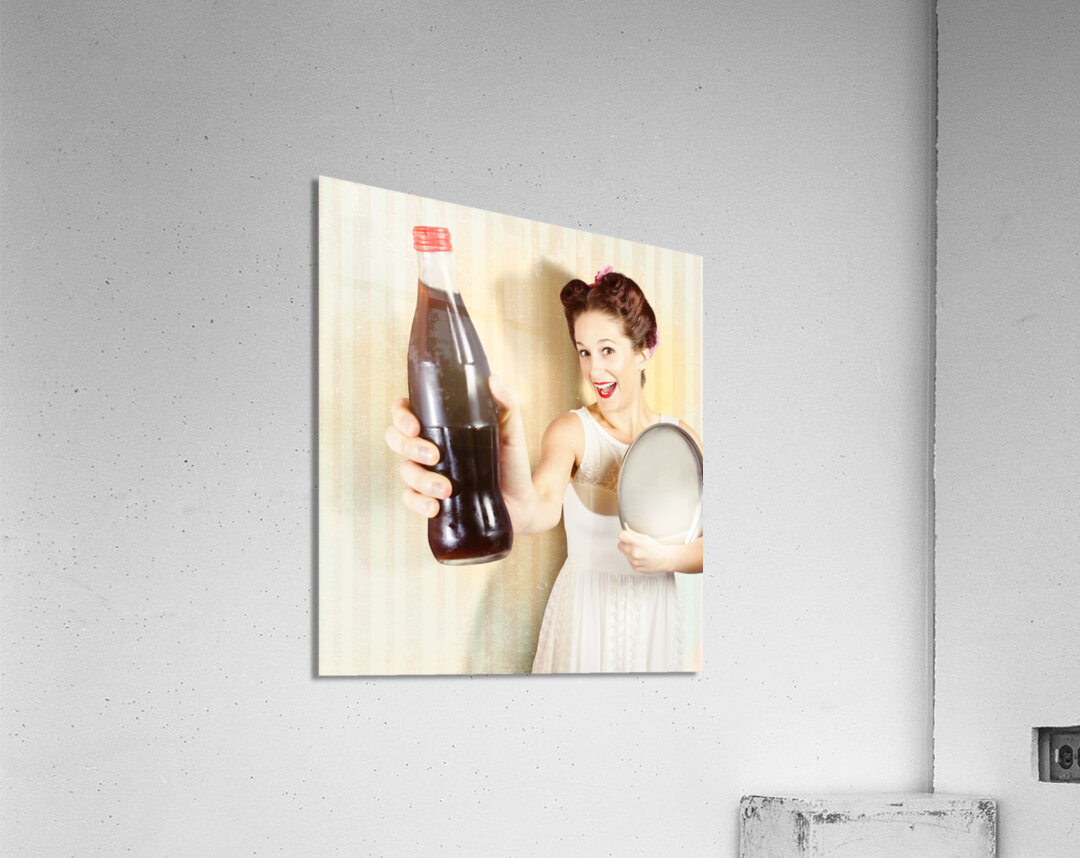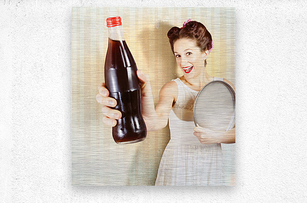 Classic hospitality portrait of a female pin-up waiter serving up a glass bottle of soda inside retro club bar. Summer party