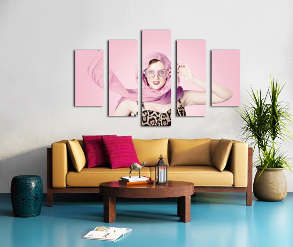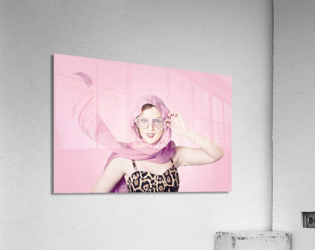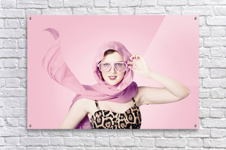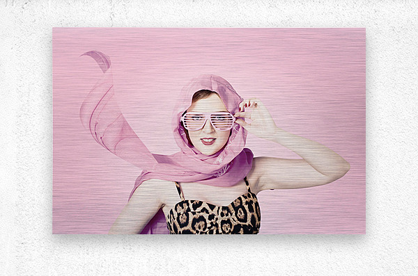 Beautiful retro fashion shot of a girl in late 20s in studio wearing a sleeveless leopard print top with pink headscarf blowing in the wind and 50s style shades. 1950s fashion pinups