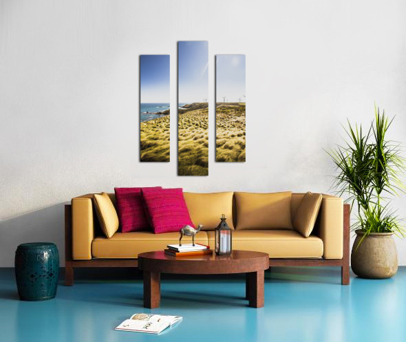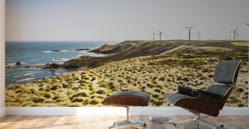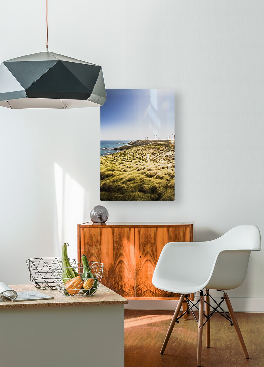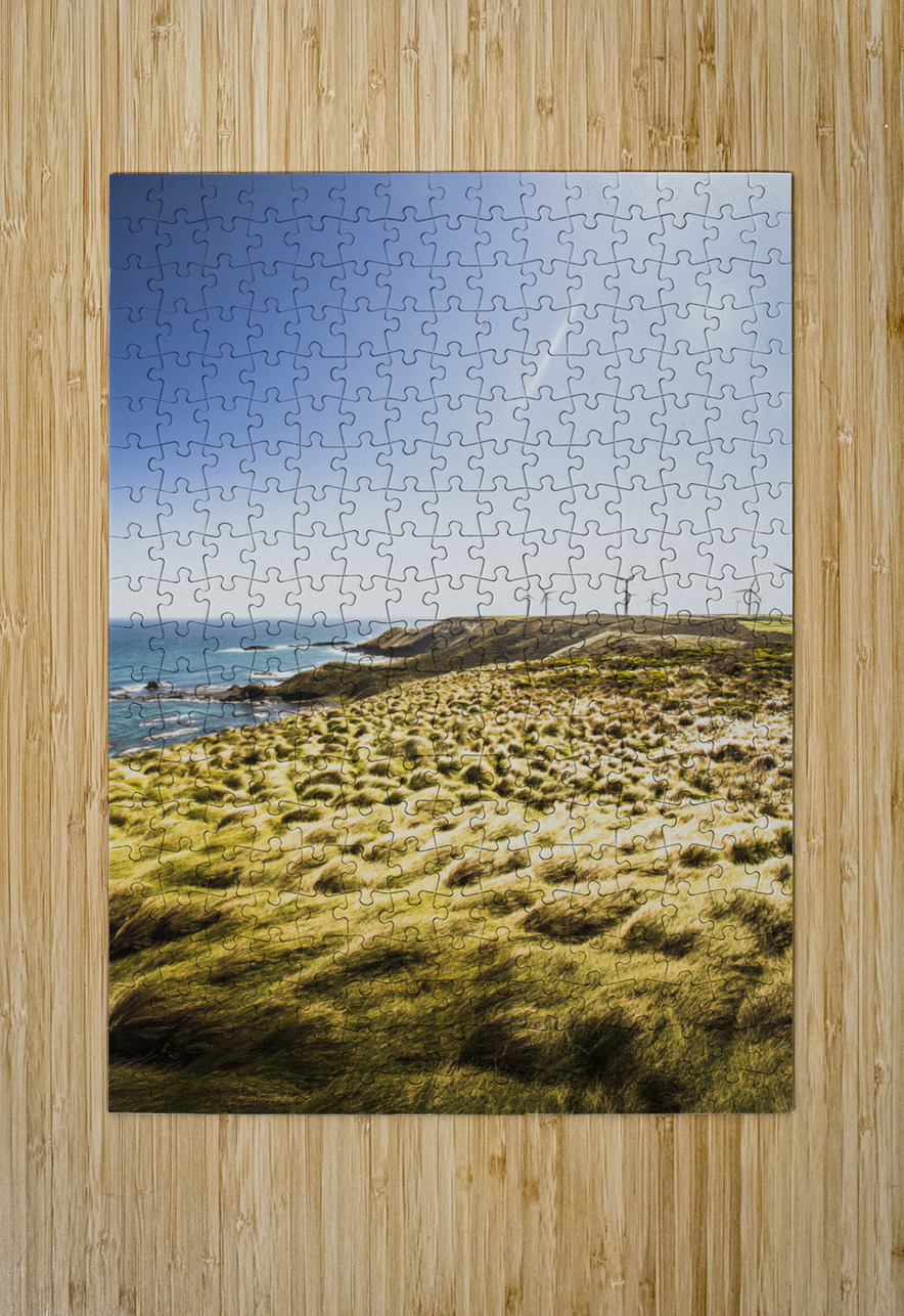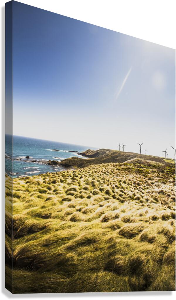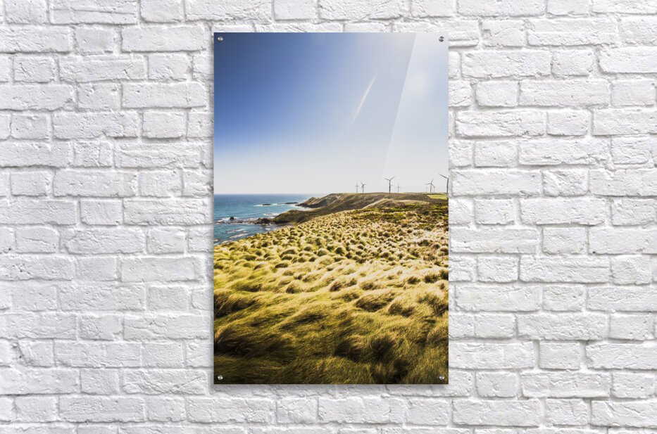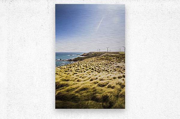 Colourful vertical seascape on windmills rocky cliffs and windswept grassy fields. Cape Grim Tasmania Australia