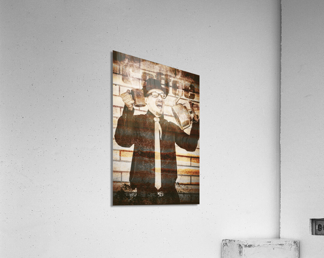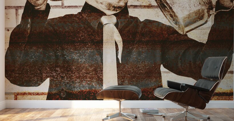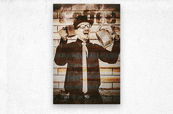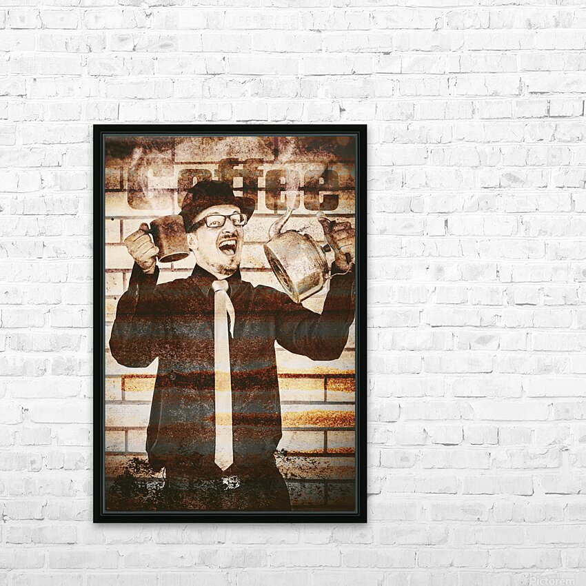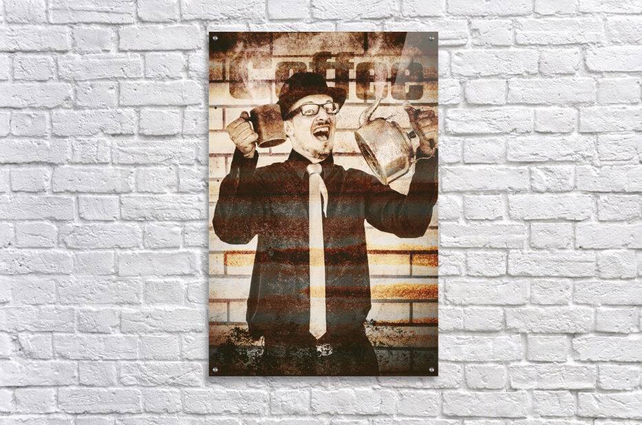 Funny rusty textured portrait of a coffeehouse employee preparing and serving espresso coffee drinks on old-fashion cafe brick wall. Bygone beverages