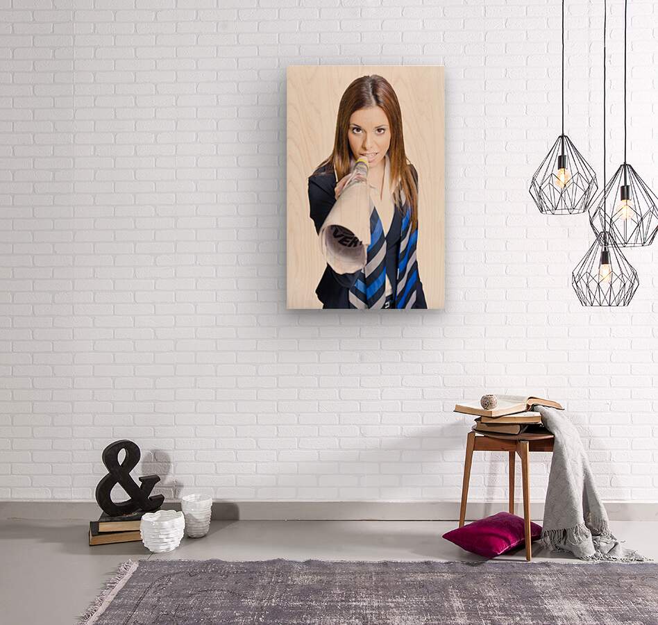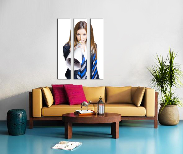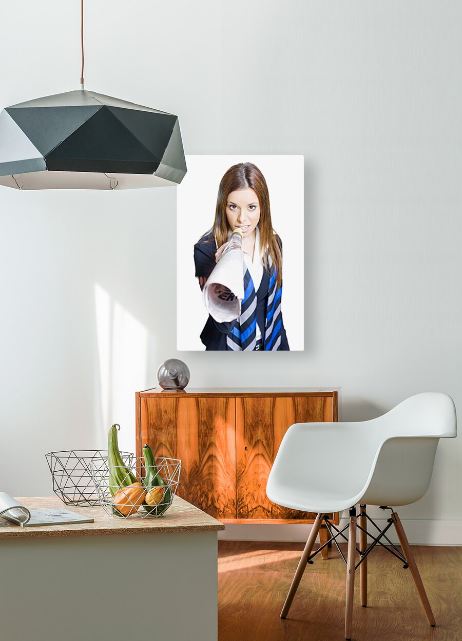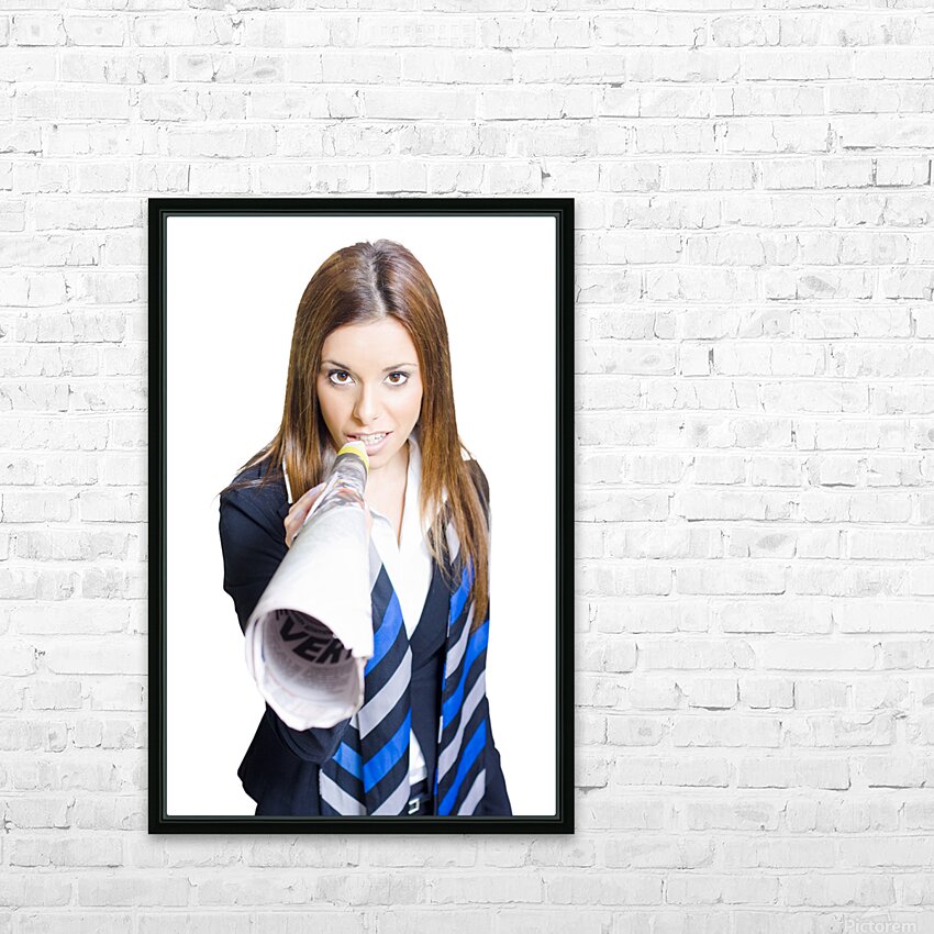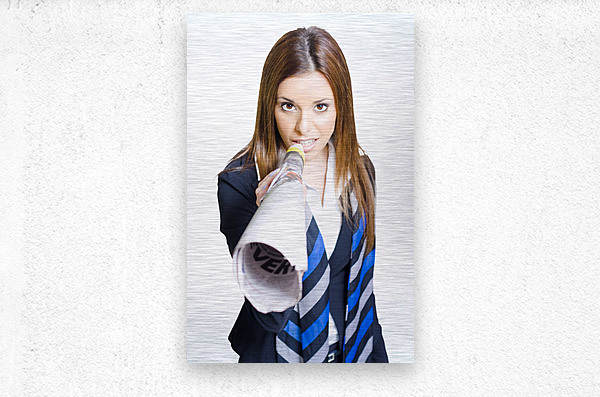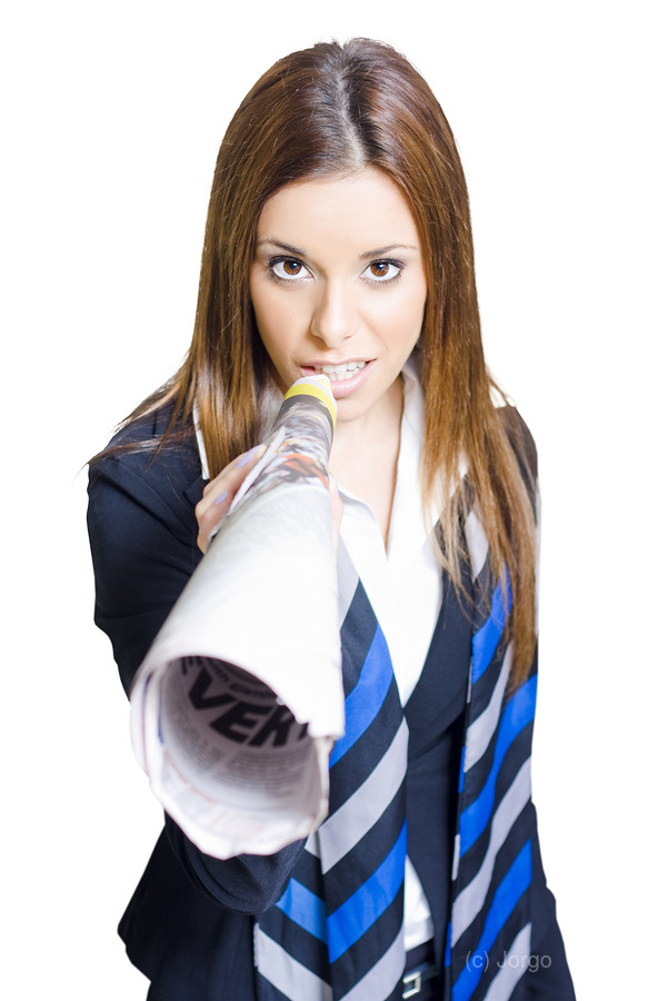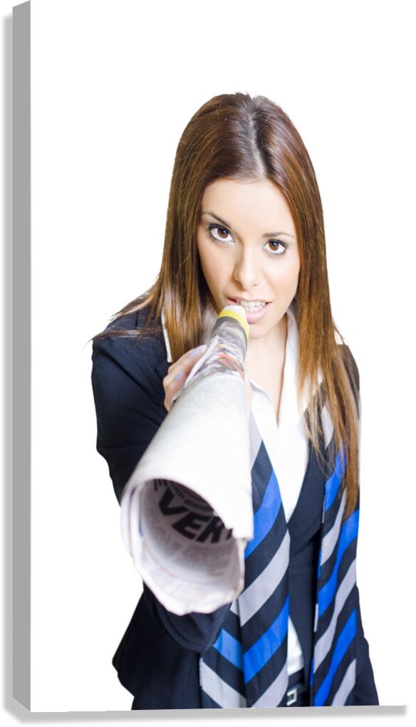 Beautiful Young Business Woman Making A News Announcement Through A Rolled Up Newspaper In A Broadcast Communication Of The Latest Information On Whit...[+]