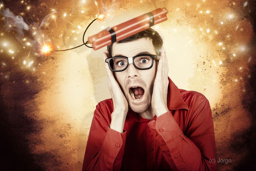 Comic portrait of a nerd businessman shouting out in fear from a stick of explosive dynamite being launched into the air