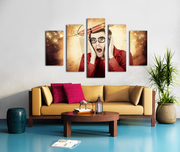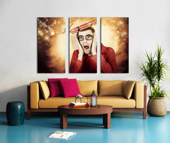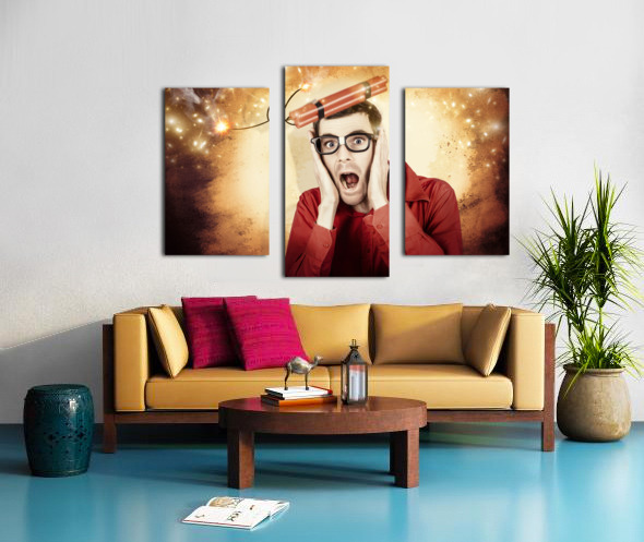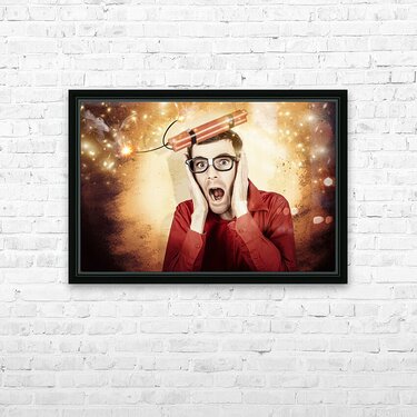 Nerd business man shouting out in fear of a bomb Frame print